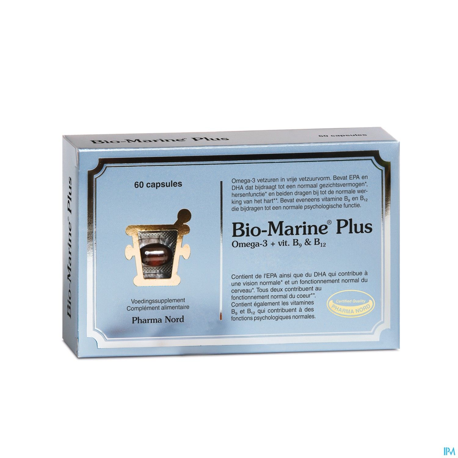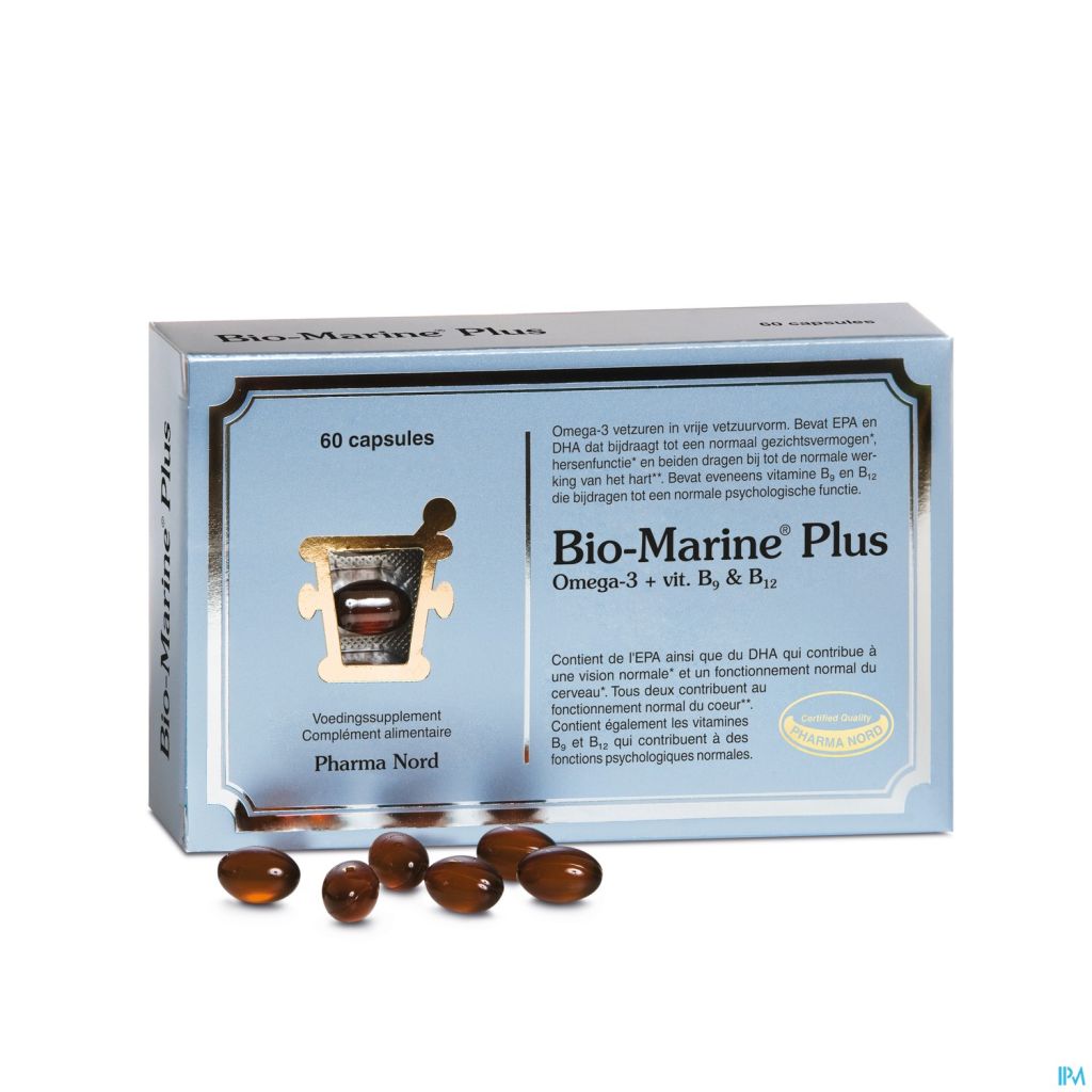 Bio-Marine Plus des laboratoires Pharma Nord contient de l'EPA ainsi que du DHA qui contribue à une vision normale et un fonctionnement normal du cerveau. Tous deux contribuent au fonctionnement normal du coeur. Ce complément alimentaire contient également les vitamines B9 et B12 qui contribuent à des fonctions psychologiques normales.