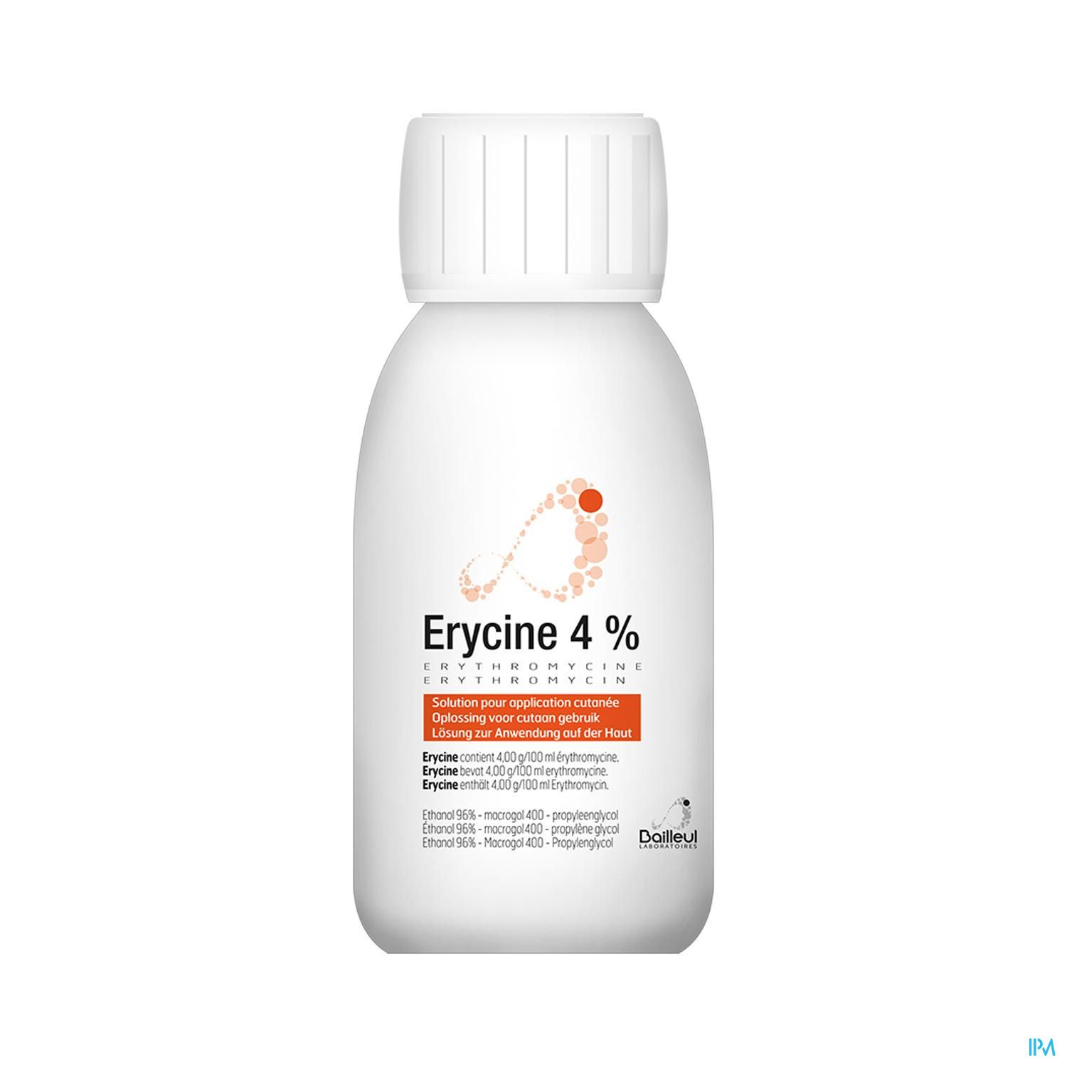 Erycine 4% solution pour application cutanée. Traitement de l'acné, en particulier de ses formes avec prédominances de phénomènes inflammatoires papulo-pustuleux.
