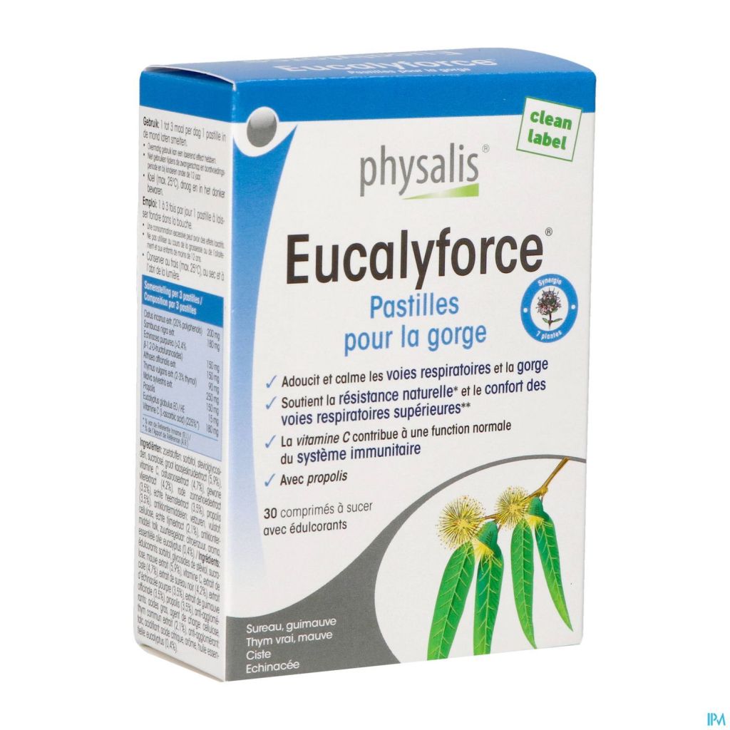 Les pastilles pour la gorge Physalis Eucalyforce® ont un effet apaisant sur la gorge et la calment. *Les extraits de bleuet et de thym soutiennent la résistance naturelle et les extraits de sureau, de grande herbe à fromage et de houx, ainsi que l'huile d'eucalyptus, améliorent le confort des voies respiratoires supérieures. La vitamine C contribue au fonctionnement normal du système immunitaire. Contient de l'extrait de ciste et de propolis !