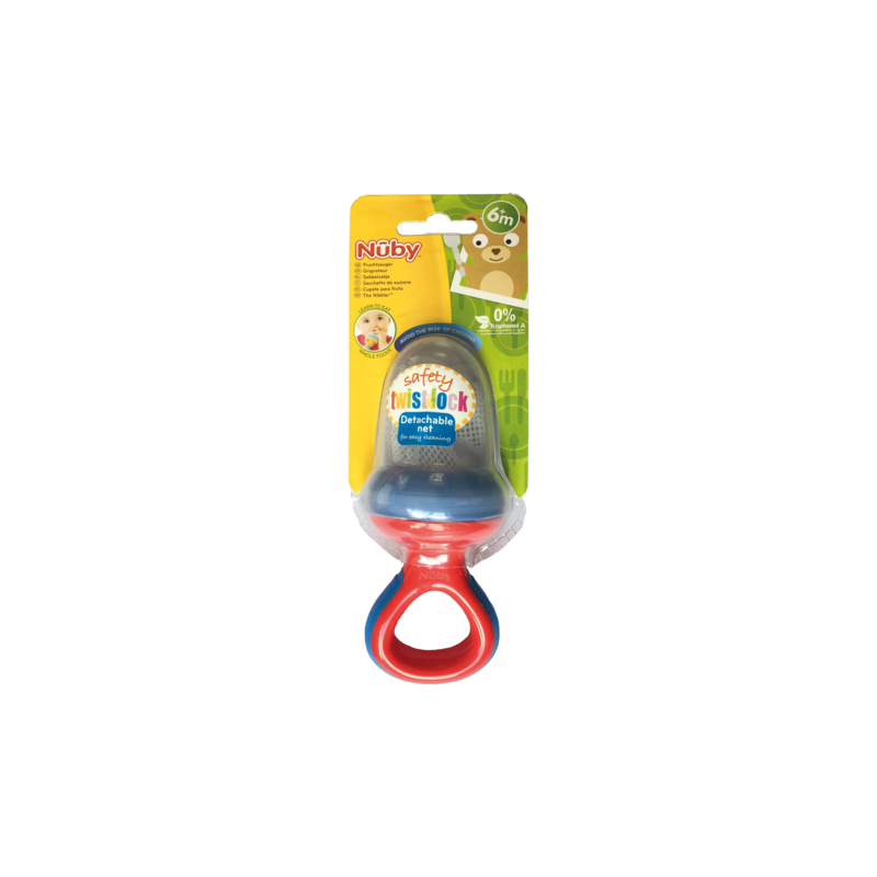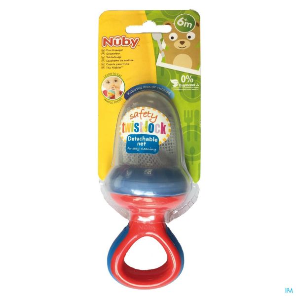 Mettez des morceaux de fruits, légumes ou biscuits dans le filet; replacez l'anneau avec le filet sur le manche. Votre petit bout peut enfin se lancer à la découverte de nouveaux goûts et textures en toute sécurité et sans risque d'étouffement. Le manche en forme d'anneau est adapté aux petites mains, mais est assez grand pour ne pas être mis en bouche. Pour une sécurité maximale, le grignoteur est pourvu d'un système de fermeture sécurisé que seul les adultes peuvent ouvrir. Le grignoteur est disponible en trois combinaisons de couleurs différentes et convient aux enfants à partir de l'âge de 6 mois.