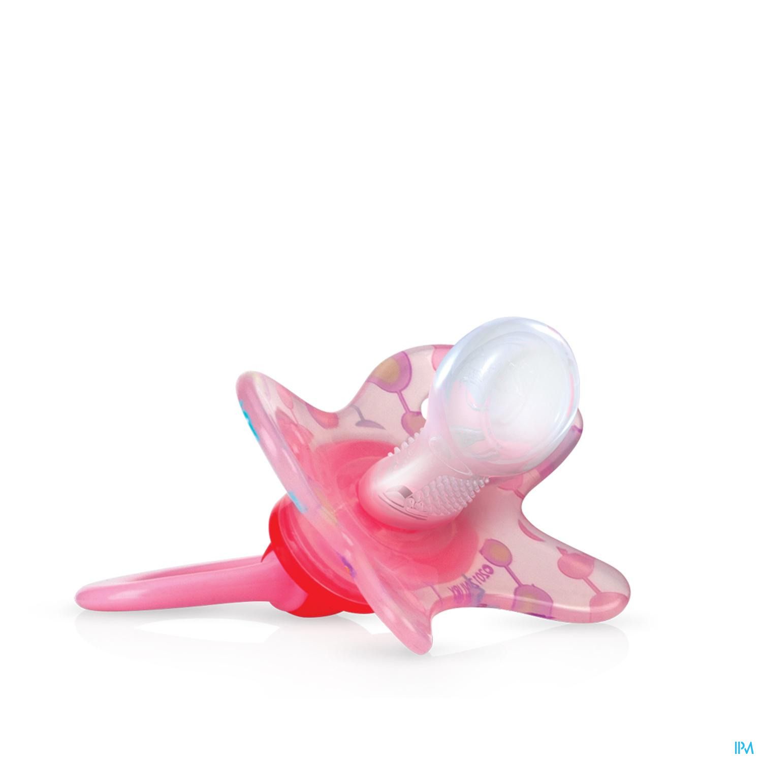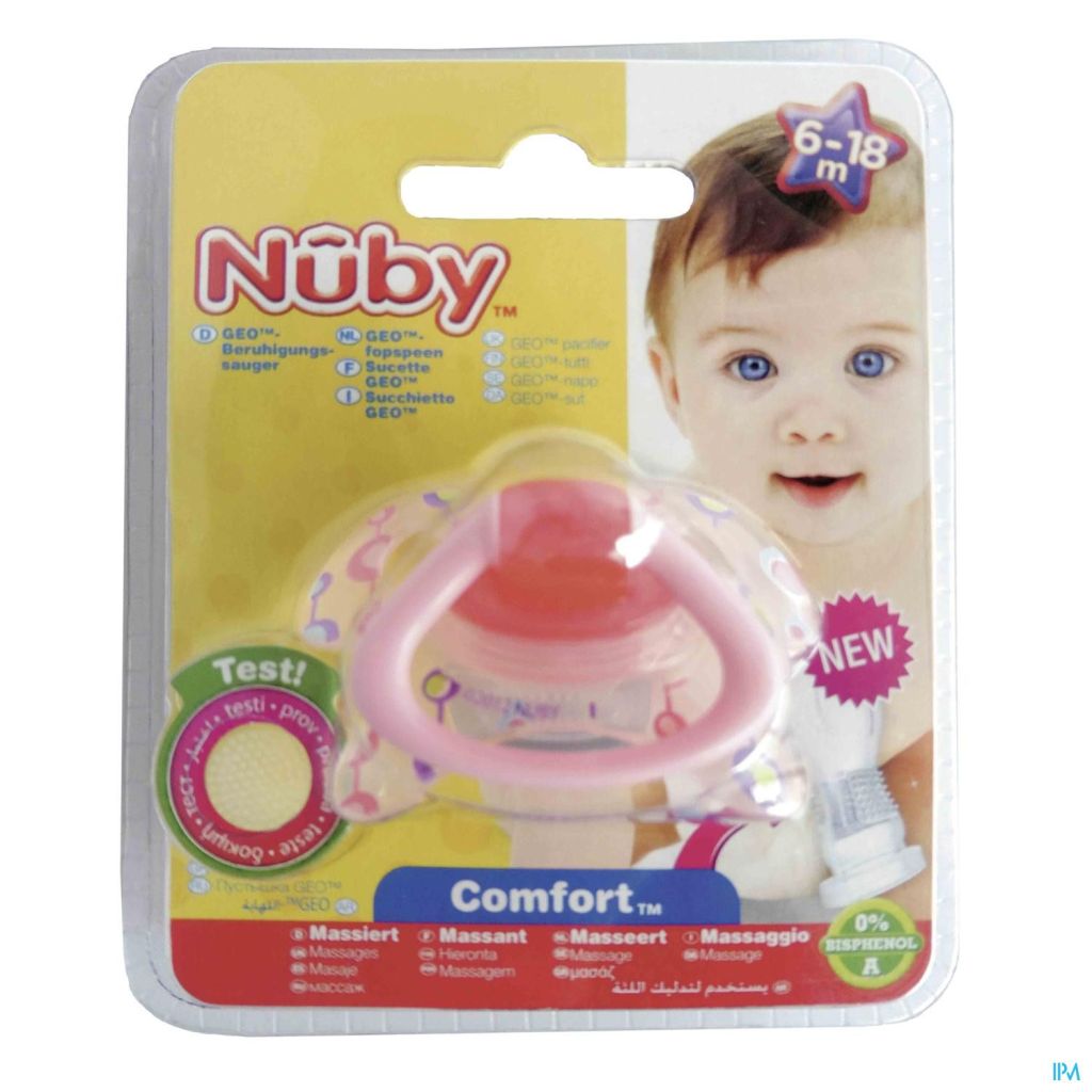 La sucette de Nûby™ possède une tétine orthodontique munie de petites brosses douces brevetées qui massent les gencives sensibles. Sa collerette aérée et ergonomique favorise une meilleure circulation d'air autour de la bouche du bébé afin de limiter les irritations.