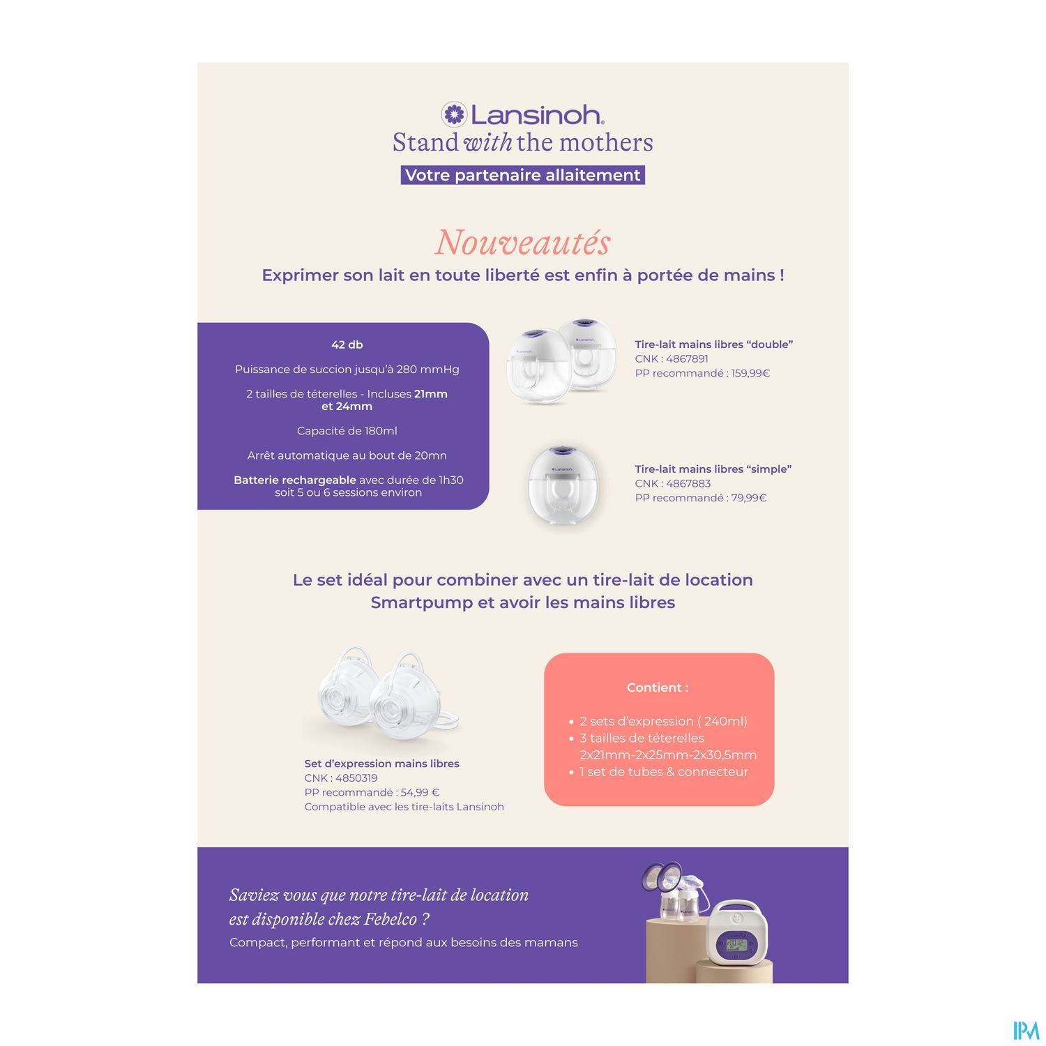 Double kit de pompage mains libres, compatible avec les tire-laits Lansinoh Pour que les mères puissent se déplacer ou se reposer librement pendant le pompage ! Comme un ensemble de pompage classique, il se connecte au tire-lait. Les bonnets ergonomiques et légers peuvent être placés à l'intérieur du soutien-gorge. La conception transparente permet de positionner facilement le sein. Chaque coupelle permet de pomper un maximum de 240 ml.