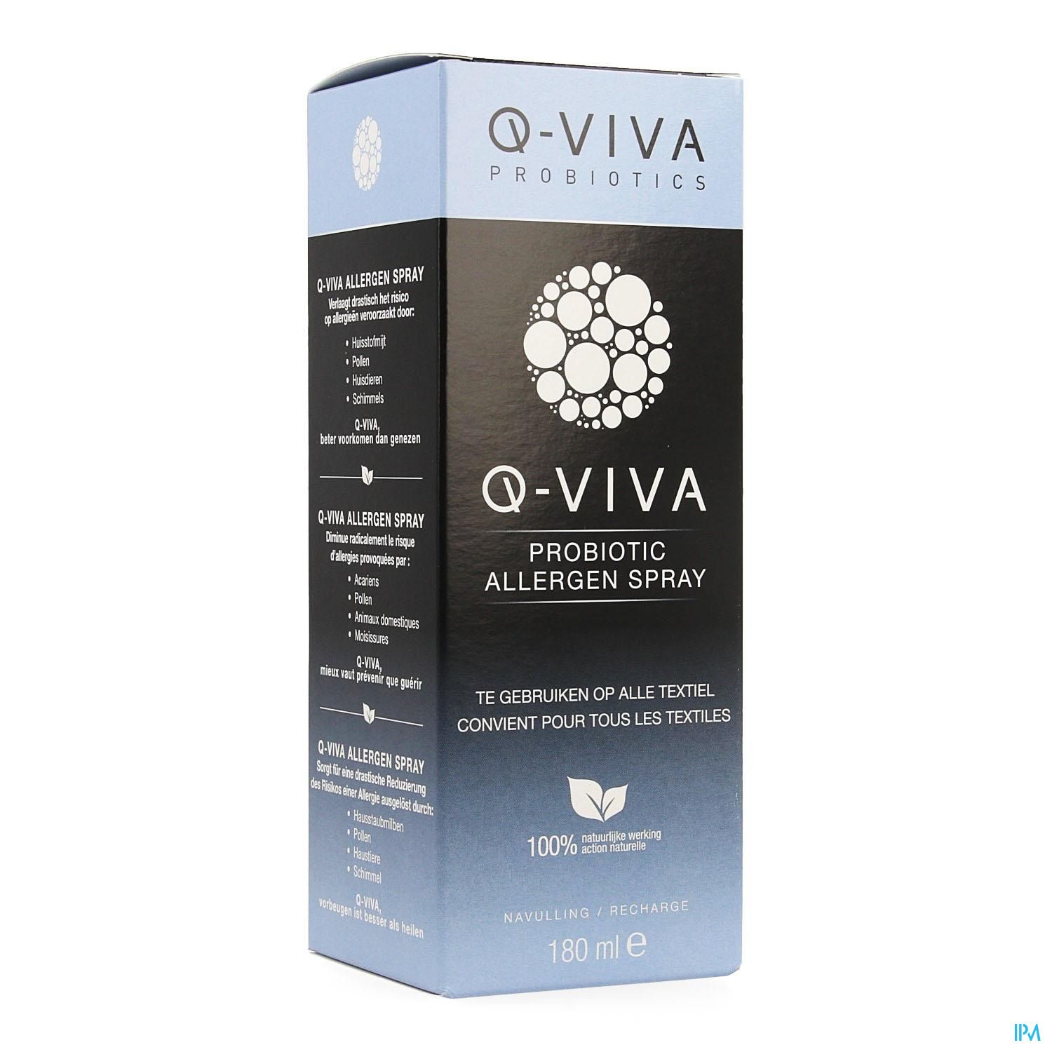 Q-viva Allergen Spray s'utilise sur tous les textiles. Lorsque vous vaporisez Q-viva Allergen Spray sur vos textiles, vous ajoutez des probiotiques à votre environnement. Grâce à son action naturelle, ce spray est 100 % sûr pour les femmes enceintes, les bébés et les animaux domestiques. 1 flacon suffit pour 150 vaporisations en moyenne.