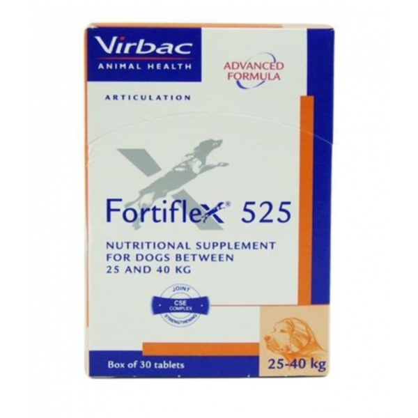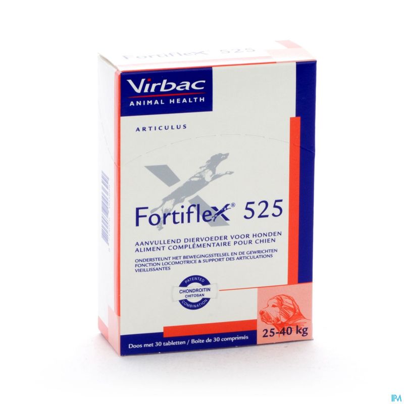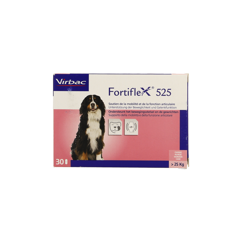 Virbac Fortiflex 525 est un complément alimentaire pour les chiens à partir de 25 kg qui soutien les articulations vieillissantes de votre animal. Fortiflex 525 est composé de sulfate de glucosamine, de chitosan et de sélénométhionine.