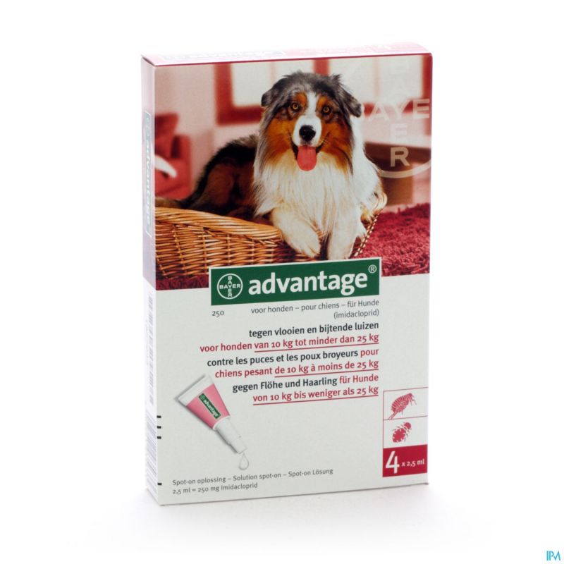 Pipette Imidaclopride E321 Advantage Dog 40 (< 4 kg) 0,4 ml 40 mg 0,4 mg Advantage Dog 100 (≥ 4 < 10 kg) 1,0 ml 100 mg 1,0 mg Advantage Dog 250 (≥ 10 < 25 kg) 2,5 ml 250 mg 2,5 mg Advantage Dog 400 (≥ 25 kg) 4,0 ml 400 mg 4,0 mg