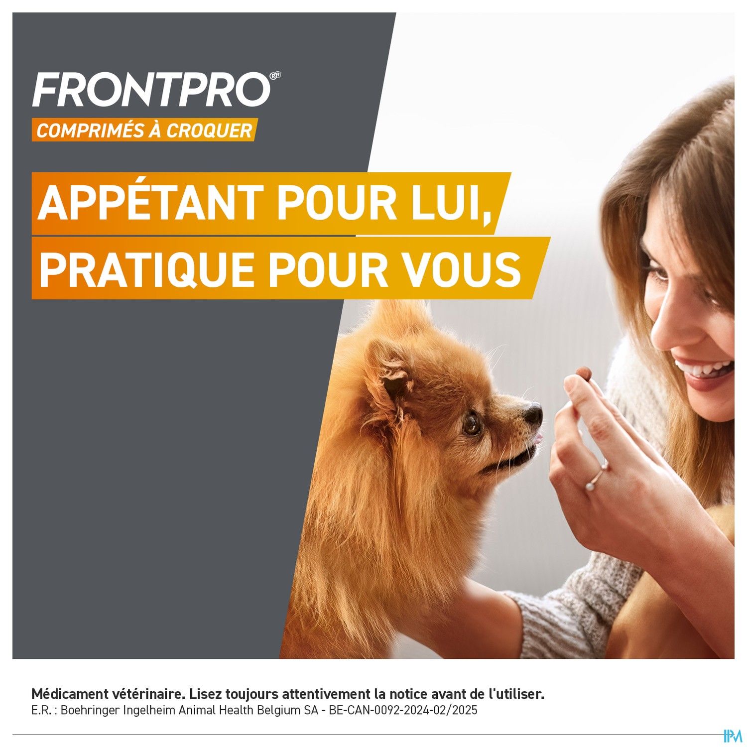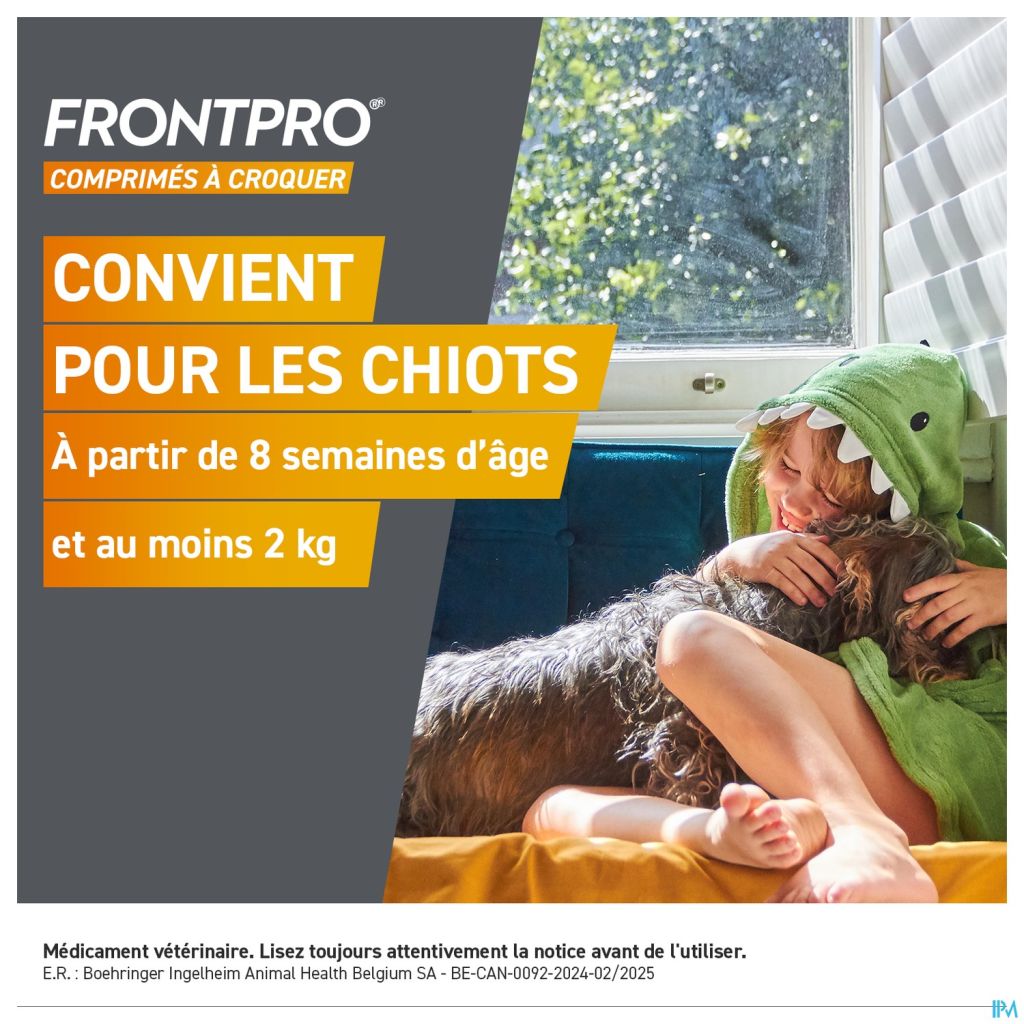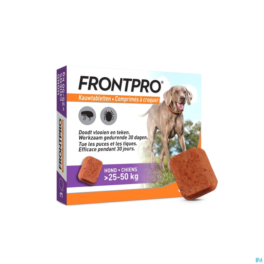 FRONTPRO® le comprimé à croquer appétant que la plupart des chiens adorent. Pratique à donner avec ou sans nourriture. Agit de l'intérieur vers l'extérieur, afin que votre chien soit prêt à recevoir des câlins à tout moment.