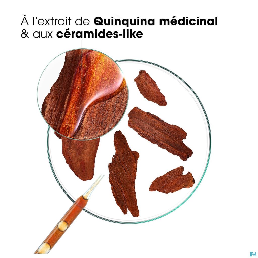 L'après-shampoing antichute fortifiant et stimulant à la Quinine issue du Quinquina médicinal agit sur le cuir chevelu et la fibre capillaire pour densifier la chevelure : il réduit la chute grâce à la Quinine et la Caféine, diminue la casse de 61%* dès la première utilisation et améliore la qualité des cheveux avec son actif Céramide-like qui protège et répare en profondeur. Les cheveux sont ainsi plus résistants, plus épais et plus brillants. Pour une action renforcée, utilisez-le sans rinçage afin de favoriser l'absorption dans la fibre capillaire et économiser de l'eau et du temps dans votre routine capillaire !
