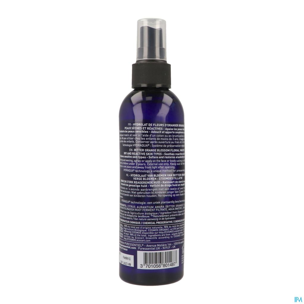 Les hydrolats Puressentiel sont 100 % d'origine naturelle et ne contiennent aucun conservateur chimique. Ils sont issus directement de la distillation à la vapeur d'eau de parties de plantes d'origine biologique. Toutes les propriétés de ces eaux riches en molécules aromatiques sont préservées grâce à la technologie HYDRAQUA® : un système unique de préservation des composants végétaux.