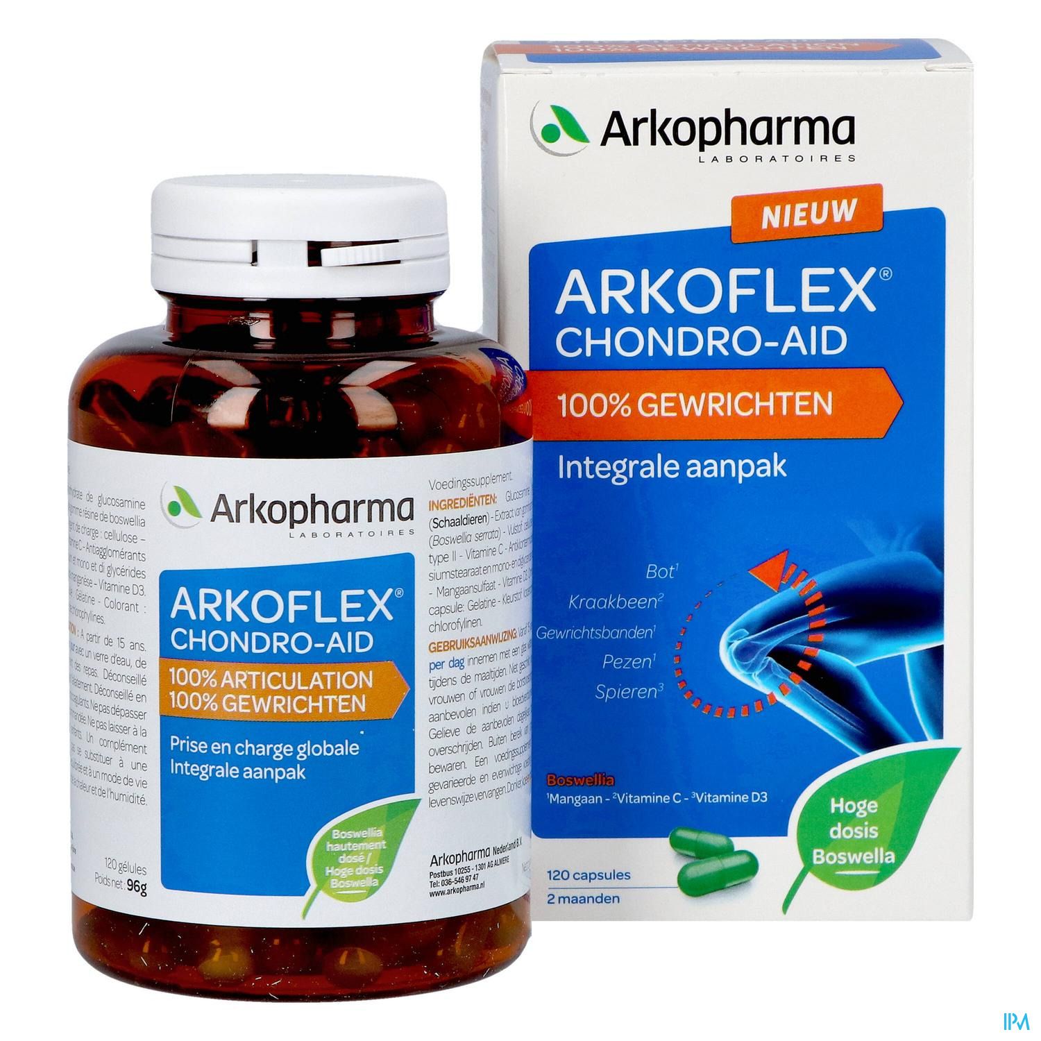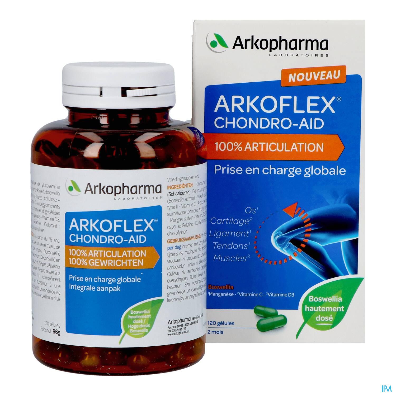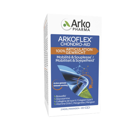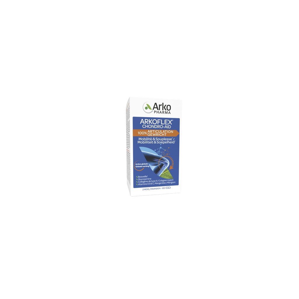 ARKOFLEX CHONDRO-AID® 100% Joints est recommandé pour le soin total de vos articulations. La formule complète contient de fortes doses d'extrait de Boswellia pour que vos articulations restent confortables et bougent normalement.