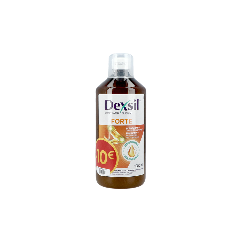 Outre le silicium bioactivé, Dexsil Forte contient également du MSM, de la glucosamine et de la chondroïtine, ainsi que des oligo-éléments tels que le cuivre et le zinc.