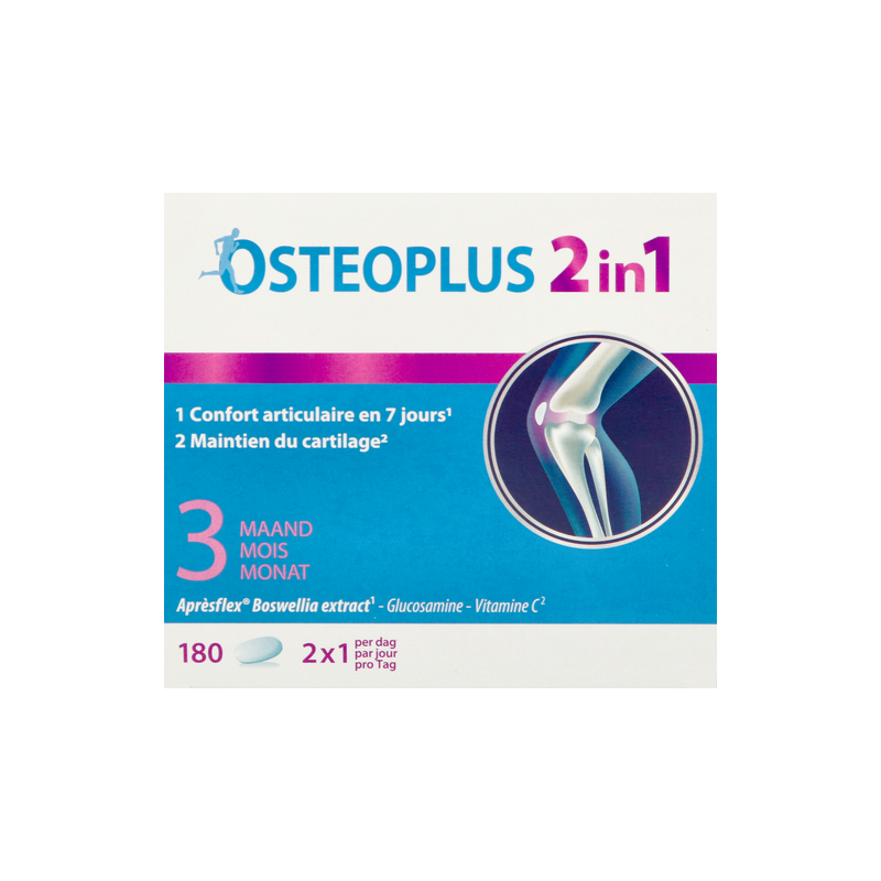 Osteoplus 2in1, grâce à sa combinaison unique d'AprèsFlex® Boswellia Extract, de glucosamine et de vitamine C, est le traitement de départ idéal et offre :