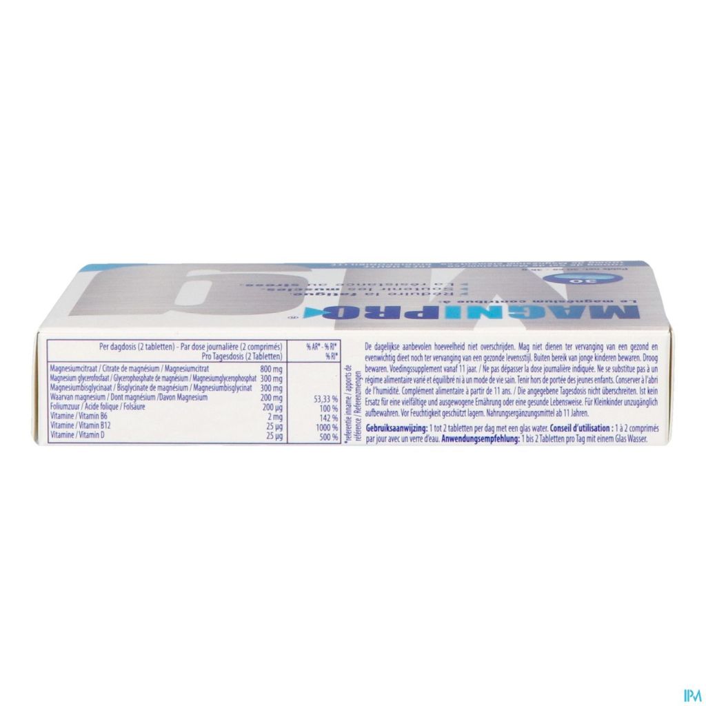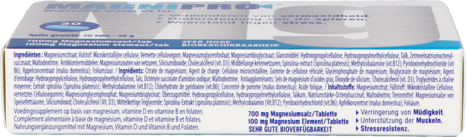 Citrate de magnésium : charge : cellulose microcristalline, gomme de cellulose réticulée ; glycérophosphate de magnésium ; bisglycinate de magnésium, agent d'enrobage : hydroxypropylcellulose, hydroxypropylméthylcellulose, talc, succinate d'octényl-03 d'amidon sodique ; maltodextrine, agents anti-agglomérants : Sels de magnésium d'acides gras, Dioxyde de silicium, Cholécalciférol (vit. D3) ; Acides gras à chaîne moyenne ; Extrait de spiruline (Spirulina platensis) ; Méthylcobalamine (vit. B12) ; Chlorhydrate de pyridoxine (vit 86) ; Concentré de pomme (malus domestica) ; Acide folique.