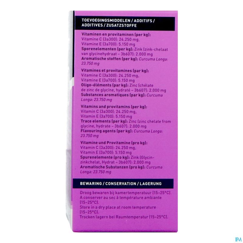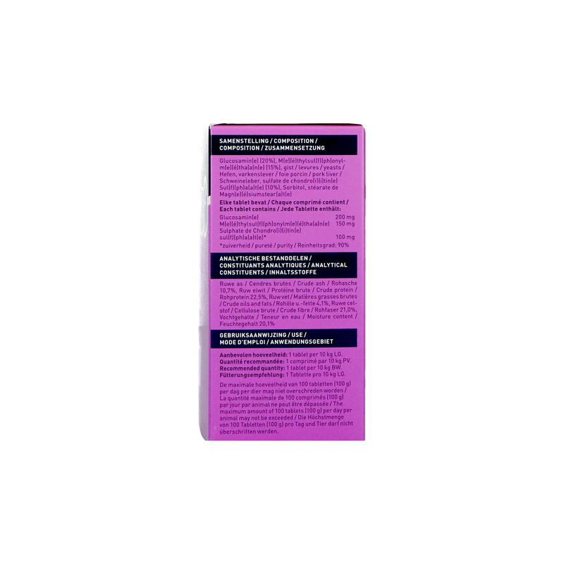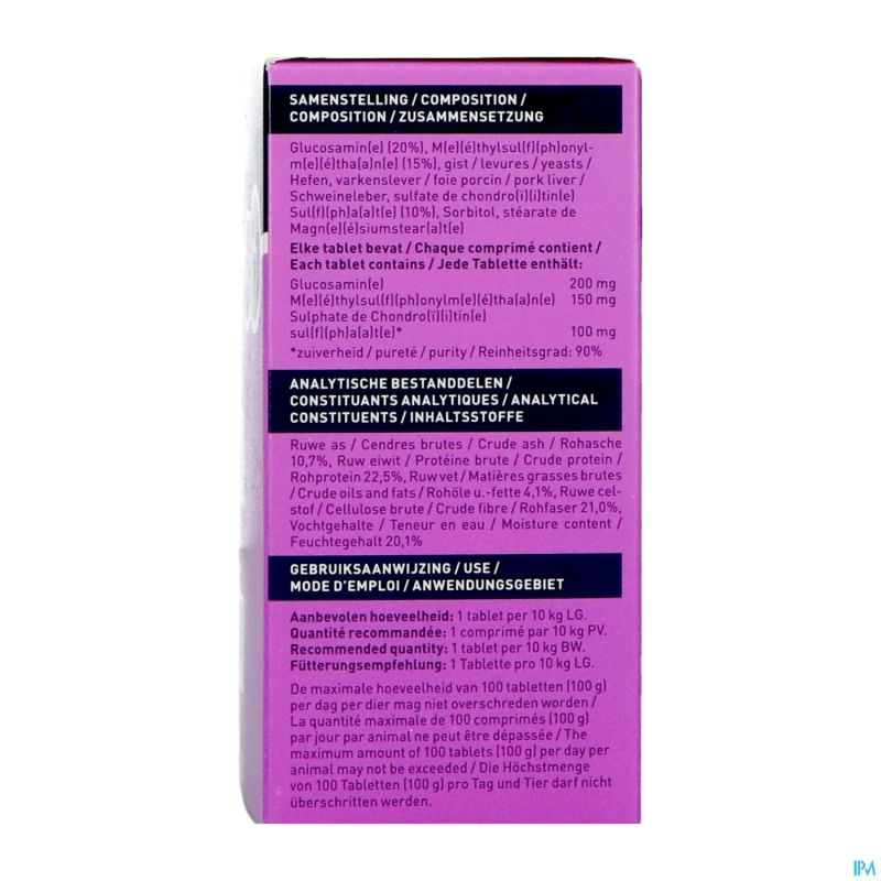 Composition par comprimé (mg/comprimé) : sulfate de glucosamine 90 % 200 mg, MSM (méthylsulfonylméthane) 150 mg, curcuma 25 mg, sulfate de chondroïtine 90 % 100 mg, chélate de zinc 15 % 10 mg, vitamine C 25 mg, vitamine E (d-alpha-tocophérol) 5 mg.