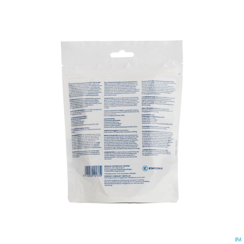 Farine de riz, flocons de pommes de terre, glycérine, farine de foie de poulet, Boswellia serrata (6,3%), levure de bière, huile d'algue, graines de lin, monopropylène glycol, collagène de poulet (dont collagène non dénaturé de type II 0,045%), huile de saumon (0,045%).