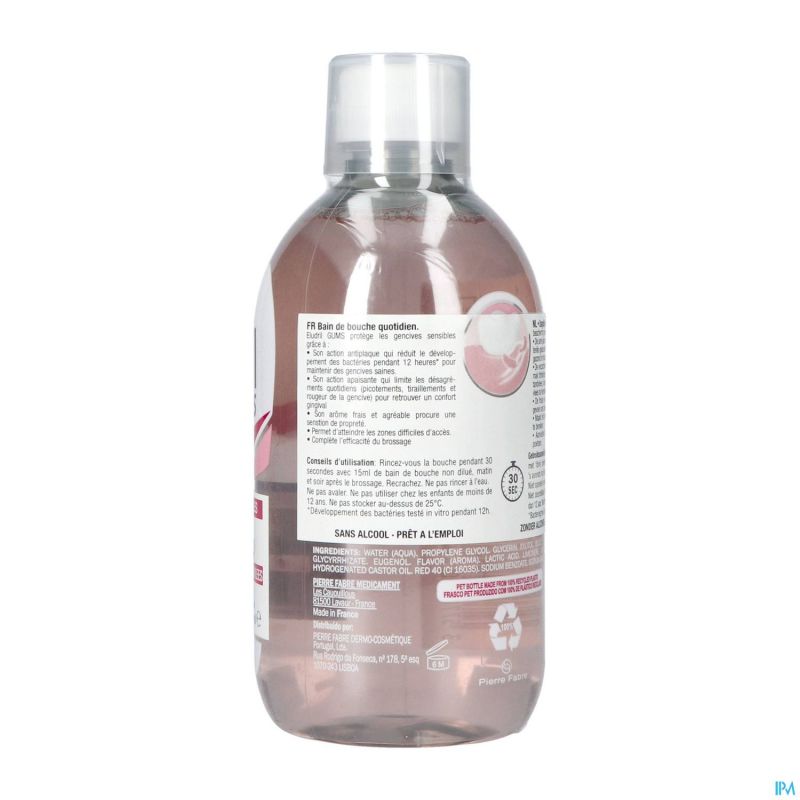 Eludril Gums bain de bouche apaise et assainit les gencives sensibles en complétant les bienfaits du brossage. Il aide à lutter contre la plaque dentaire, principale cause de la sensibilité et de l'irritation des gencives: les gencives deviennent 2 fois moins sensibles après 3 semaines d'utilisation¹. Sans alcool, prêt à l'emploi, Eludril Gums bain de bouche apporte une protection de 12h contre les bactéries responsables de la plaque dentaire et limite les inconforts gingivaux (picotements, tiraillements et rougeurs des gencives). Il allie efficacité et plaisir d'utilisation grâce à son agréable sensation de fraîcheur mentholée et acidulée. Il convient aux adultes et enfants dès 12 ans. Son flacon PET est recyclable et élaboré avec 100% de plastique recyclé