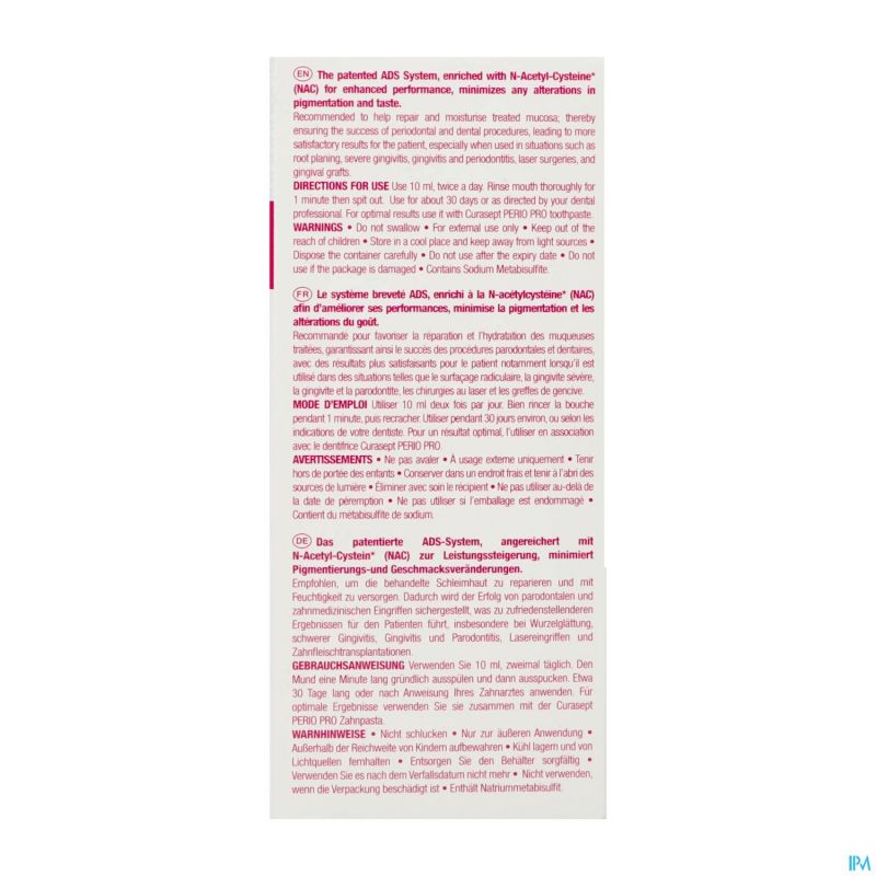 Le bain de bouche Curasept ADS DNA Perio Pro est la version actualisée de Curasept ADS Perio, spécialement conçu pour le soin intensif des gencives en cas de maladie parodontale. Ce bain de bouche combine l'action prouvée de la chlorhexidine avec une formule améliorée pour une protection et une restauration optimales.