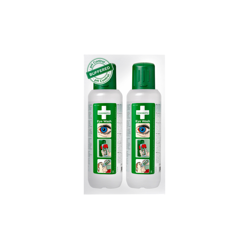 Parallèlement à l'effet de dilution et de rinçage de la substance dangereuse, la douche oculaire tamponnée Cederroth a aussi un effet neutralisant sur les projections basiques ou acides. L'effet est généralement plus puissant avec les bases qu'avec les acides. Une solution de rinçage non tamponnée agit uniquement en diluant et en rinçant l'acide ou la base, ce qui nécessite une plus grande quantité de liquide et par conséquent une durée de rinçage plus longue. Vous pouvez rincer en toute sécurité avec Cederroth Eye Wash car il est 100% sans phosphate.