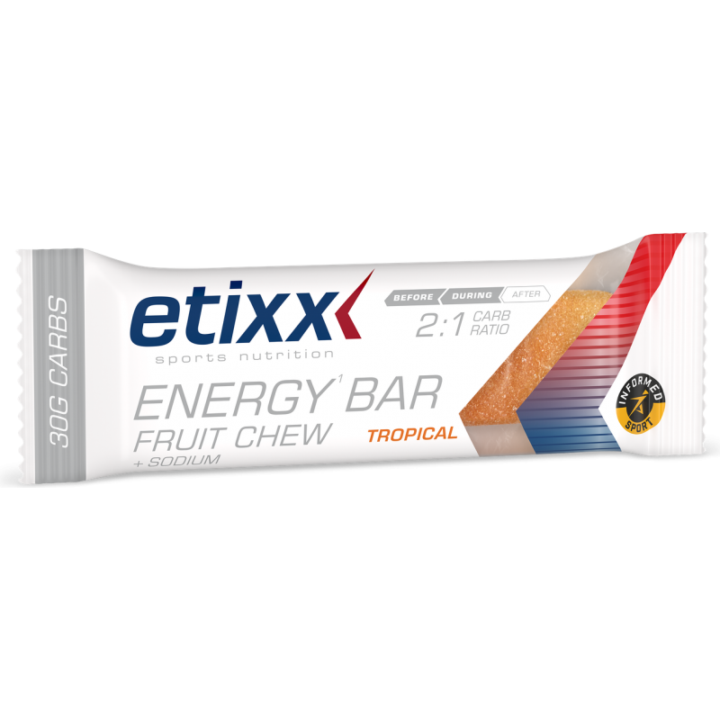 L'Etixx Energy Bar Fruit Chew contient 30g de glucides, dans un rapport optimal de 2 :1 (glucose : fructose) pour une absorption optimale des glucides. De plus, chaque barre contient également 100 mg de sodium.