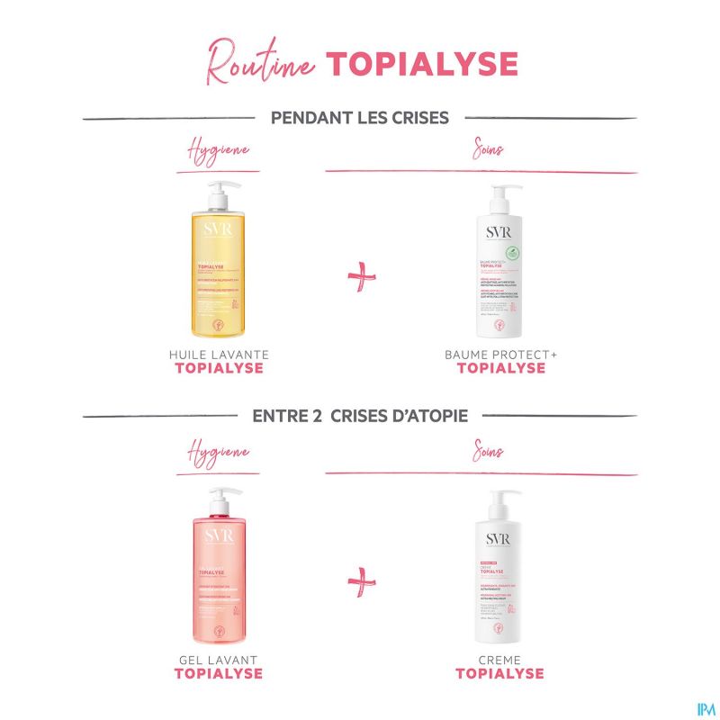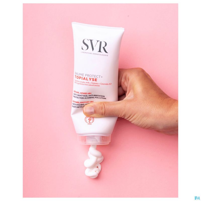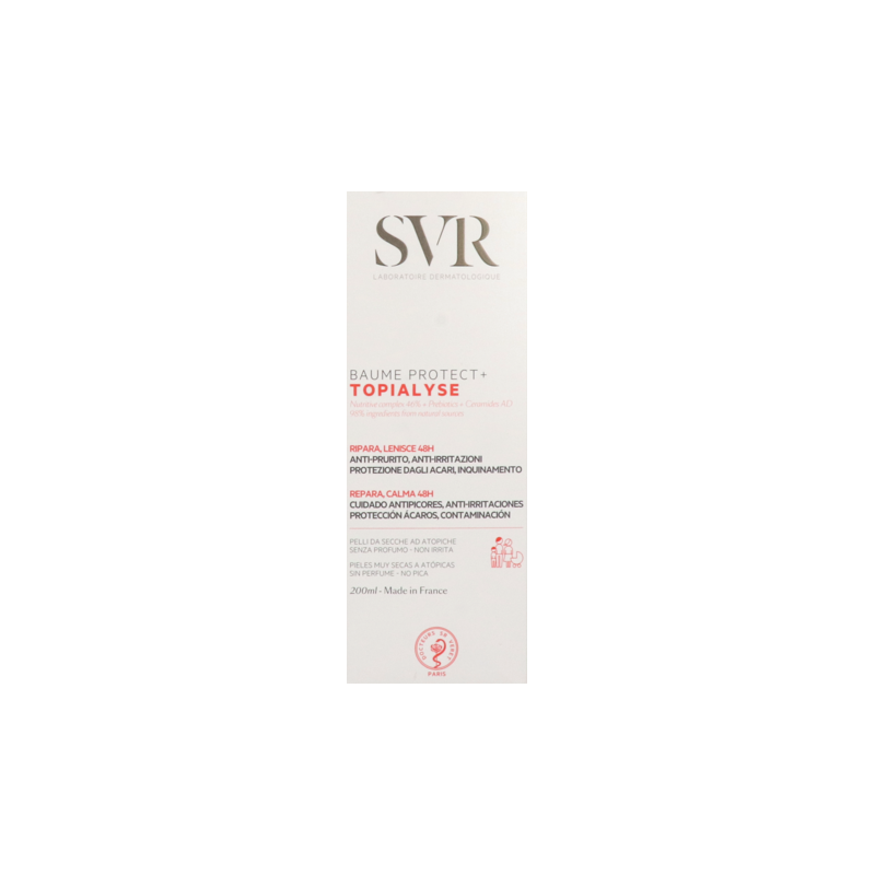 Peaux sensibles sèches à très sèches à tendance atopique. Dès la naissance, pour toute la famille. Corps, visage. Ne pique pas. TOPIALYSE BAUME PROTECT+, c'est le premier soin enrichi en Céramides AD brevetées1 qui apporte une protection face aux agressions extérieures (acariens, pollution…) qui peuvent aggraver les irritations et les crises de grattages. Ce baume apaise immédiatement et durablement les sensations de démangeaisons pour une peau apaisée, protégée et réparée durablement. Sa texture nourrissante relipidante fond et laisse un film protecteur à la surface de la peau avec un effet anti-adhésion des microparticules de pollution (PM 2.5)2 . Non gras et non collant, l'habillage se fait directement après l'application ! Le Baume Protect+ est composé de seulement 20 ingrédients à 98% d'origine naturelle. Sans parfum mais avec une odeur délicate. 1- Etude ex-vivo 2-Evaluation, par analyse d'image, de l'efficacité d'un produit cosmétique de soin à limiter la rémanence d'un dépôt de microparticules de carbone (modèle de pollution aux particules fines) réalisé après application du produit