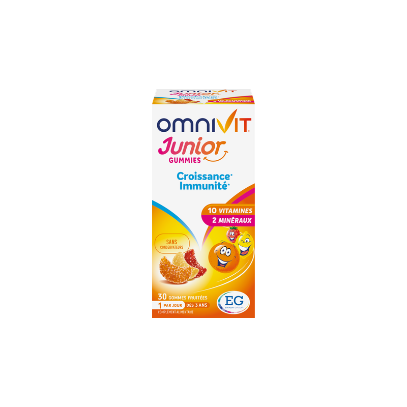 Les vitamines Omnivit Junior Gummies sont des gommes qui associent des minéraux et vitamines pour la croissance et l'immunité de votre enfant. Omnivit Junior Gummies est un complément alimentaire développé pour les besoins spécifiques des enfants dès 3 ans. Arômes et colorants 100 % naturels, délicieux goût de fruit, convient aux végétaliens.