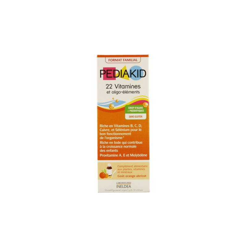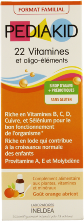 PEDIAKID® 22 Vitamines & Oligo-éléments est fabriqué sans gluten, sans allergènes, sans ingrédients d'origine animale, sans OGM, sans arômes ou colorants artificiels et sans conservateurs.