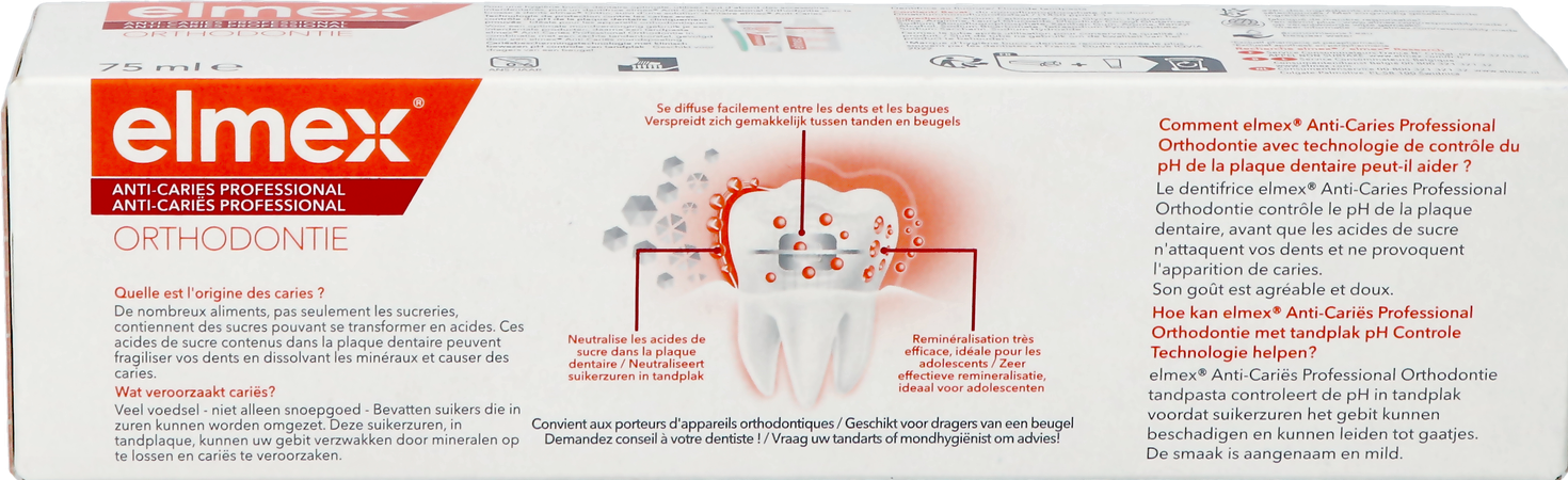 Le dentifrice elmex® Ortho contient une technologie qui contrôle le pH de la plaque, neutralisant les acides de sucre avant qu'ils n'attaquent les dents et ne provoquent des caries. Le dentifrice Ortho a également été développé pour se répartir facilement entre les dents et les appareils dentaires afin de cibler les zones difficiles à atteindre, offrant ainsi une protection efficace.