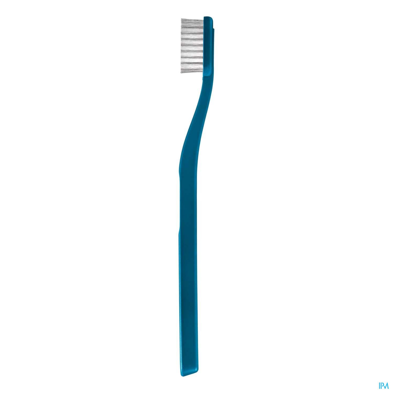 Brosse à dents avec un manche en plastique recyclé et dotée de poils souples d'origine organique.
