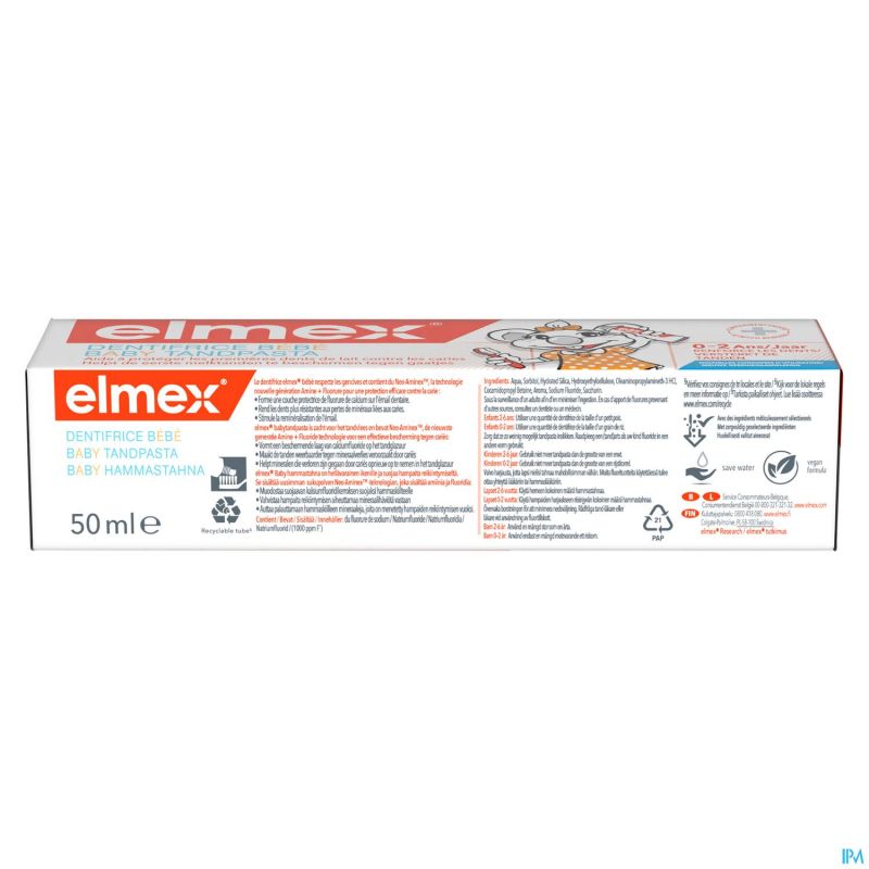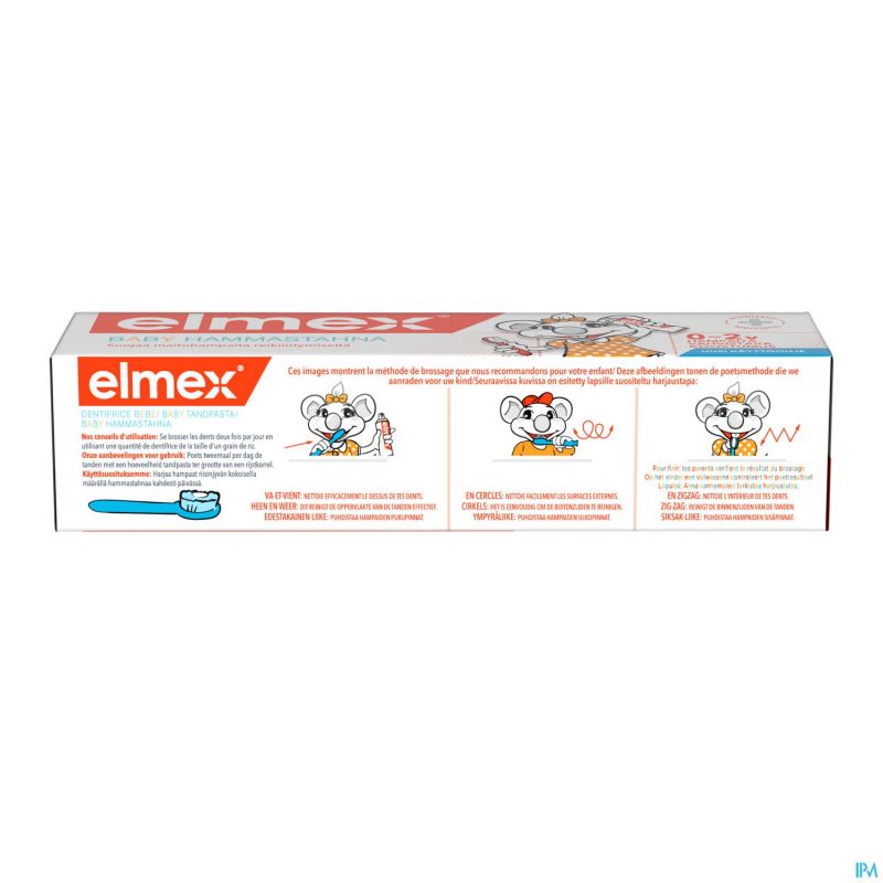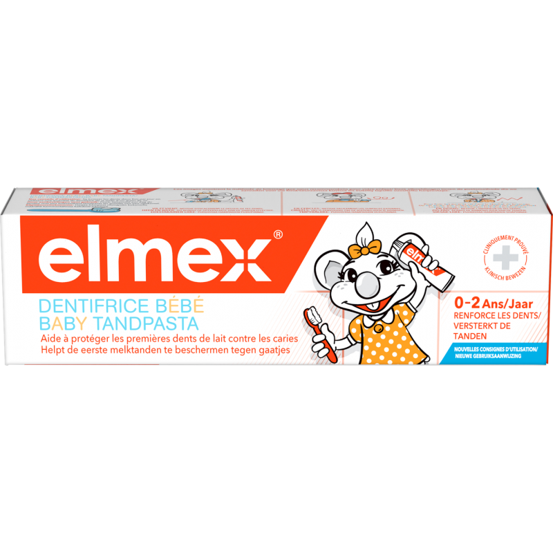 Prenez soin des dents de lait de votre bébé et brossez-le avec le dentifrice elmex Baby, une bonne préparation pour des dents d'adulte saines. Ce dentifrice 0-2 ans à 1000 ppm de fluor respecte les gencives de votre bébé et contient du Neo-Aminex : la dernière technologie amine + fluor. La technologie de ce dentifrice pour nouveau-nés protège efficacement contre les caries et forme une couche protectrice de fluorure de calcium sur l'émail des dents. Le dentifrice pour l'hygiène bucco-dentaire des nouveau-nés ré-enrichit l'émail en minéraux perdus à cause des caries et rend les dents plus résistantes à la perte de minéraux liée aux caries. Ce dentifrice pour nouveau-nés a fait l'objet d'une attention particulière : la formule végétalienne est présentée dans un tube recyclable.