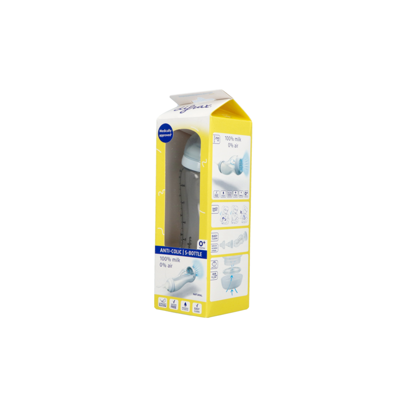 Le biberon en S, unique en son genre, peut être utilisé dès la naissance (également pour les bébés prématurés). La bouteille S a une base amovible. Il est ainsi facile de remplir la bouteille S de glaçons de lait maternel et de la nettoyer après usage. Vous pouvez tirer votre lait maternel directement dans la bouteille S Natural avec le tire-lait Difrax adapté aux mamans.