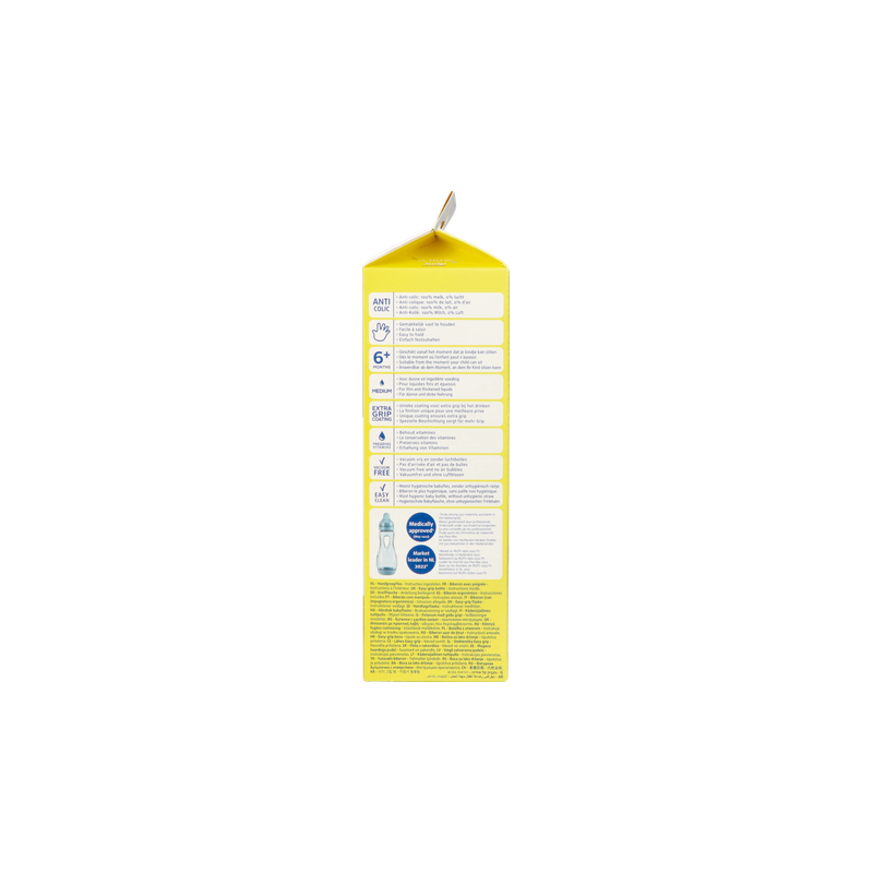 Au fond de la bouteille à poignée se trouve une valve anti-colique unique. Cela empêche la succion par le vide et réduit le risque de rots, de régurgitations et de coliques. La tétine du biberon a une finition douce. Le fond amovible rend le biberon facile à nettoyer. Développé par l'équipe médicale de Difrax.