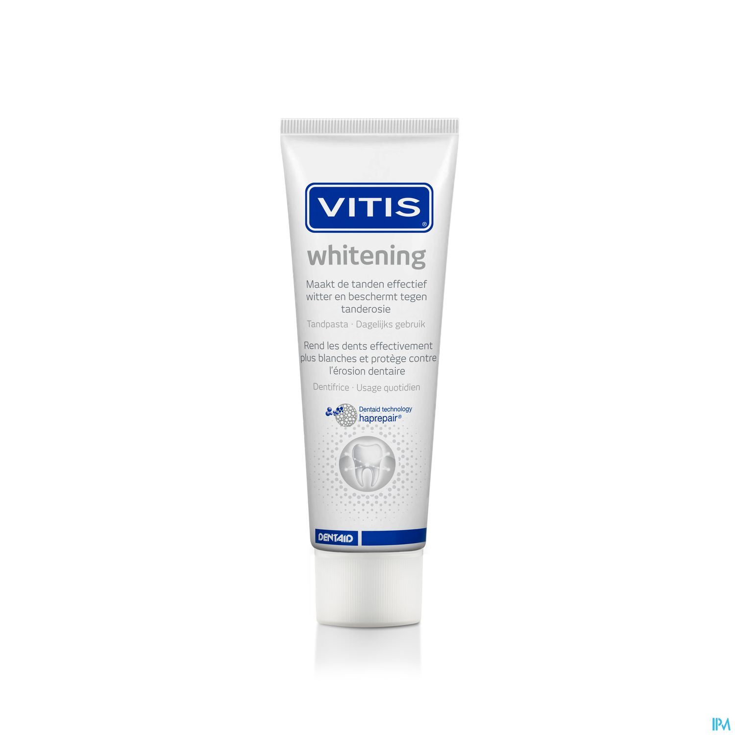 La puissance de VITIS Whitening réside dans la DENTAID haprepair technologie® en 5 actions mise au point pour VITIS Whitening. Cette dernière fonctionne grâce à l'action de minuscules particules d'hydroxyapatite qui se fixent sur la surface dentaire. Leur taille leur permet d'être entièrement absorbées par l'émail et la dentine des dents. Ce faisant, elles comblent les irrégularités et les trous de la surface dentaire. Les dents sont plus lisses, plus brillantes et retrouvent leur blancheur.