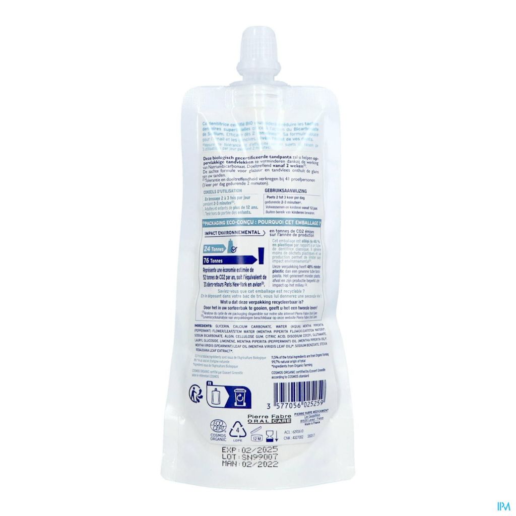 ELGYDIUM blancheur dentifrice éco conçu certifié BIO contribue à réduire les taches superficielles (alimentation, tabac…) et maintient la blancheur naturelle des dents tout en contribuant à réduire son impact environnemental grâce à son emballage éco-conçu. Son efficacité est rapide et durable : son effet, visible dès deux semaines sur les tâches superficielles des dents, se renforce au fil du temps et des utilisations¹. Sa formule à 99,7% d'ingrédients d'origine naturelle est douce pour l'émail. Elle contient du Bicarbonate de sodium. Léger, flexible, recyclable, son emballage nécessite lors de sa fabrication et de son transport, 69% de CO2 et 85% d'eau en moins qu'un emballage classique².