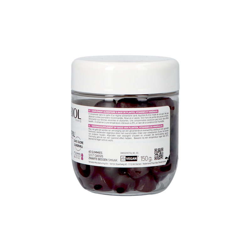 Agent de charge : maltitols – extrait sec de fucus (Fucus vesiculosus L.) - arôme naturel - extrait sec de fruit de caroube (Ceratonia siliqua L.) - gélifiant : pectines - extrait sec de cassis (Ribes nigrum L.) - acidifiant : acide citrique - extrait sec de rhadiole rose (Rhodiola rosea L.) - acidifiant : citrates de sodium - concentré de carotte (Daucus carota L.) & cassis (Ribes nigrum L.) - agent d'enrobage : cire de carnauba – chlorhydrate de pyridoxine - picolinate de chrome.