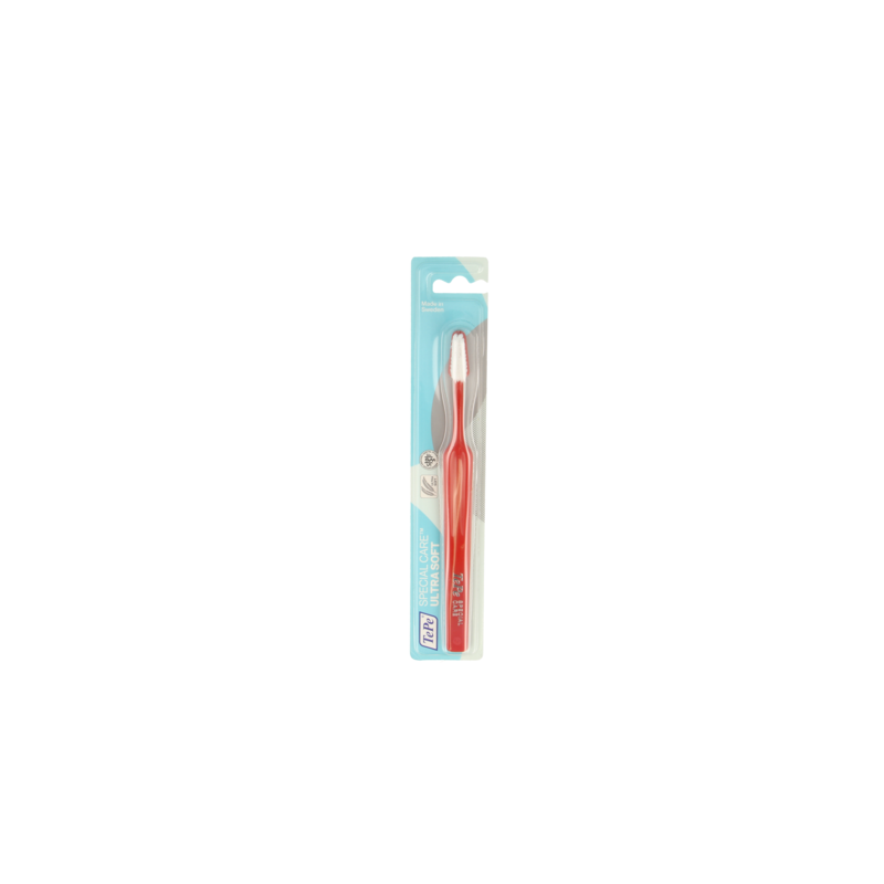 TePe Special Care™ est une brosse à dents dotée de 12 000 filaments ultra souples. Cette brosse à dents est recommandée pour le brossage des dents après une chirurgie buccale et pour les patients présentant des tissus buccaux douloureux ou très délicats, des surfaces radiculaires très sensibles, une bouche extrêmement sèche et après une radiothérapie. Il peut être plié pour un meilleur accès après avoir été chauffé à l'eau chaude.
