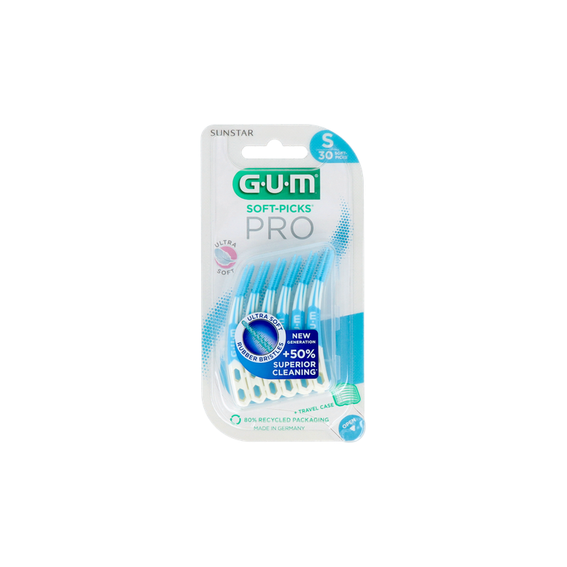 GUM SOFT-PICKS PRO est une nouvelle génération de produits interdentaires d'une efficacité de nettoyage supérieure, conçus pour le plus grand confort du patient. La tête s'inspire d'une brosse interdentaire et le nouveau SOFT-PICK PRO possède désormais une masse dense de poils en caoutchouc conçus pour nettoyer une plus grande surface et atteindre les endroits difficiles d'accès, y compris les surfaces approximales et sulculaires. Les études cliniques montrent une augmentation de 50 % de l'efficacité du nettoyage. * GUM SOFT-PICKS PRO est l'outil interdentaire idéal pour permettre à vos patients de commencer le nettoyage interdentaire et de s'y conformer. Basé sur la franchise GUM SOFT-PICKS** préférée de nos patients, ce nouveau produit interdentaire offre maintenant encore plus de confort et de facilité d'utilisation.