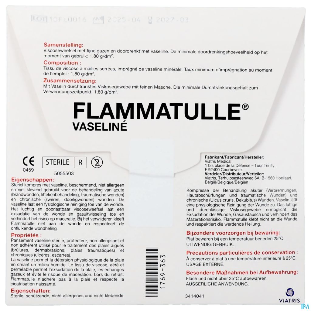 Flammatulle vaseliné des laboratoires Abbott est un pansement vaseliné stérile, protecteur, non allergisant et non adhérent utilisé pour le traitement des plaies aiguës (brûlures, dermabrasions, plaies traumatiques) et chroniques (ulcères, escarres).