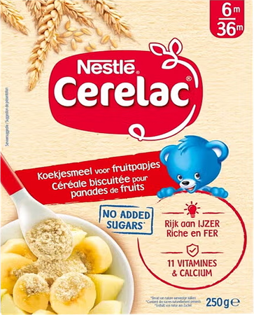 Nestlé CERELAC ce sont des céréales biscuitées déjà écrasées, ce biscuit est donc facile à doser et se mélange facilement à la panade de fruits pour pour introduire en douceur le gluten dans l'alimentation de votre bébé. Il offre une variation idéale au pain et est riche en Calcium, et Vitame D et en Zinc. Son apport important en fer couvre déjà 50% de l'apport journalier recommandé en fer. Le fer contribue au système immunitaire et au développement cognitif de votre bébé.