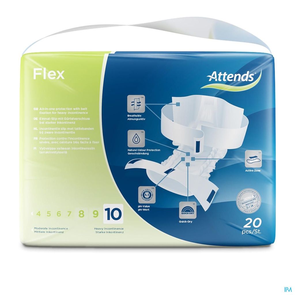 Attends Flex 10 est un change-complet à ceinture conçu pour l'incontinence urinaire sévère et/ou l'incontinence fécale. Le système d'attache permet de bien ajuster la ceinture autour de la taille avant de mettre la protection en place. La ceinture élastique assure un ajustement confortable au plus près du corpt tout en empêchant les fuites. L'indicateur d'humidité aide les patients et les soignants à tirer le meilleur parti de chaque protection.