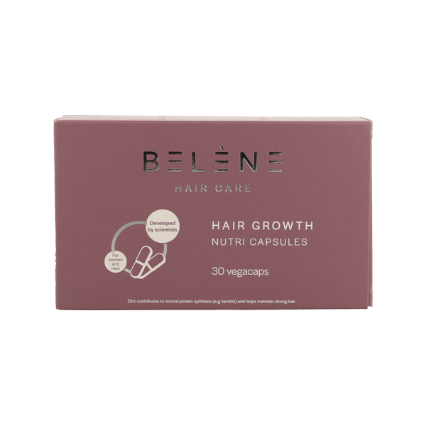 BELENE® Hair Growth Nutri Capsules contribuent au maintien de cheveux forts : ces capsules sont conçues par des scientifiques et contiennent des ingrédients naturels qui renforcent les cheveux de l'intérieur. BELENE® Hair Growth Nutri Capsules contiennent le Nutri V Complex*; ce complexe contribue à la santé des cellules des cheveux et à la croissance des cheveux1 et maintient une pigmentation normale des cheveux2: • 250 mg de peptides de kératine d'origine naturelle • 75 mg de Vitis vinifera5 • Complexe de minéraux et de vitamines avec : zinc1, cuivre2, vitamines B3, B5, B63 et biotine4.