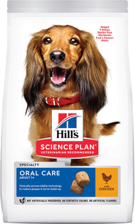HILL'S SCIENCE PLAN Oral Care Adult with Chicken est un aliment pour chiens doté d'une technologie dentaire cliniquement prouvée pour réduire la formation de la plaque et du tartre.