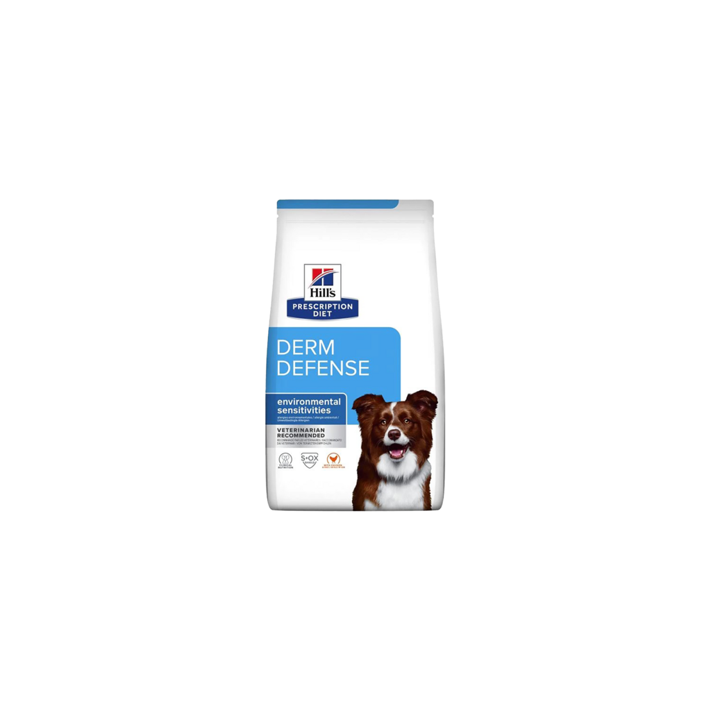 Les croquettes pour chien Hill's Prescription Diet Derm Defense au poulet sont des aliments diététiques complets destinés à soutenir la fonction cutanée en cas de troubles de la peau et de perte excessive de poils chez les chiens adultes. Cet aliment contient des niveaux élevés d'acide linoléique et d'acide eicosapentaénoïque et docosahexaénoïque réunis.