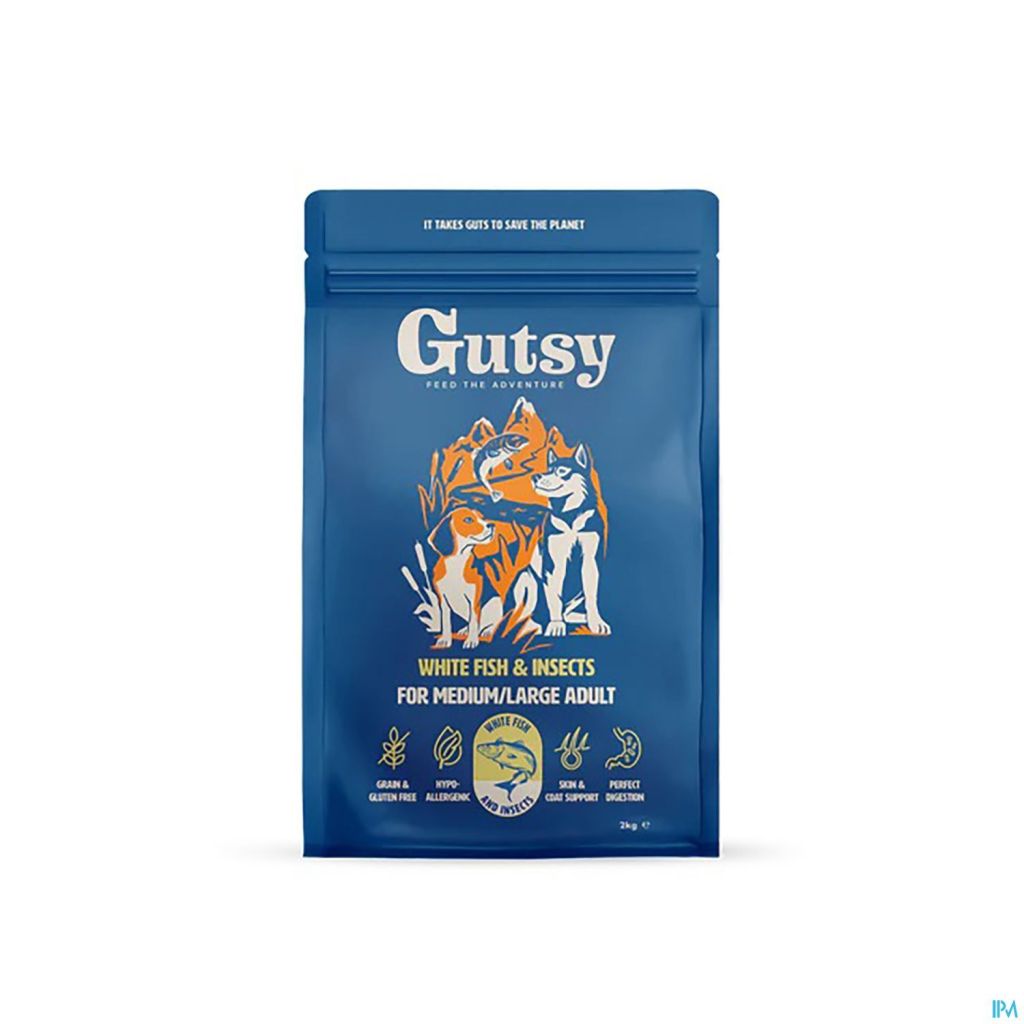 Les croquettes Gutsy White Fish & Insect pour grands chiens adultes sont des croquettes hypoallergéniques, totalement exemptes de céréales et de gluten. Fabriquées avec amour pour les mangeurs sensibles.