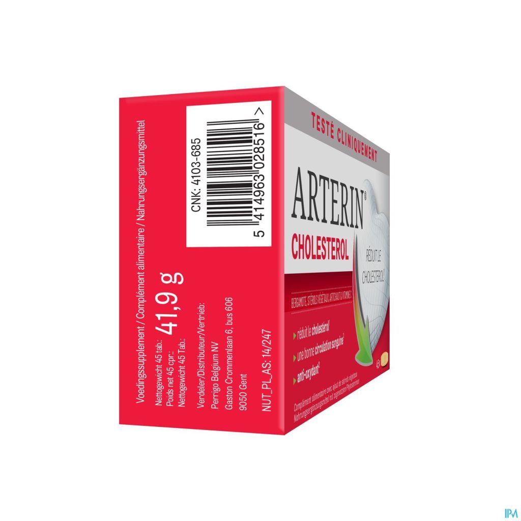 Précautions: Les compléments alimentaires ne peuvent pas remplacer une alimentation variée et équilibrée ni un mode de vie sain. Il n'est pas destiné aux personnes qui ne doivent pas contrôler leur taux de cholestérol. Il faut éviter de consommer plus de 3 g de stérols végétaux ajoutés par jour. (1 comprimé contient 120 mg de stérols végétaux – 2 comprimés contiennent 240 mg de stérols végétaux). Consultez votre médecin si vous prenez déjà des médicaments hypolipémiants. Ne convient pas aux femmes enceintes et allaitantes. Uniquement destiné aux adultes. Arterin® Cholesterol doit être utilisé dans le cadre d'un régime alimentaire équilibré et varié, comprenant une consommation régulière de fruits et légumes afin de maintenir le taux de caroténoïdes.