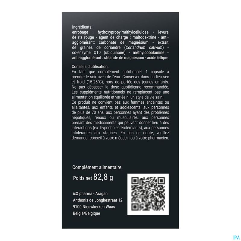 75 mg de levure de riz rouge dont 2,9 mg de monacolines, 50 mg d'extrait de coriandre, 20 mg de coenzyme Q10, 200 µg d'acide folique (100 % AR), 2,5 µg de vitamine B12 (100 % AR).
