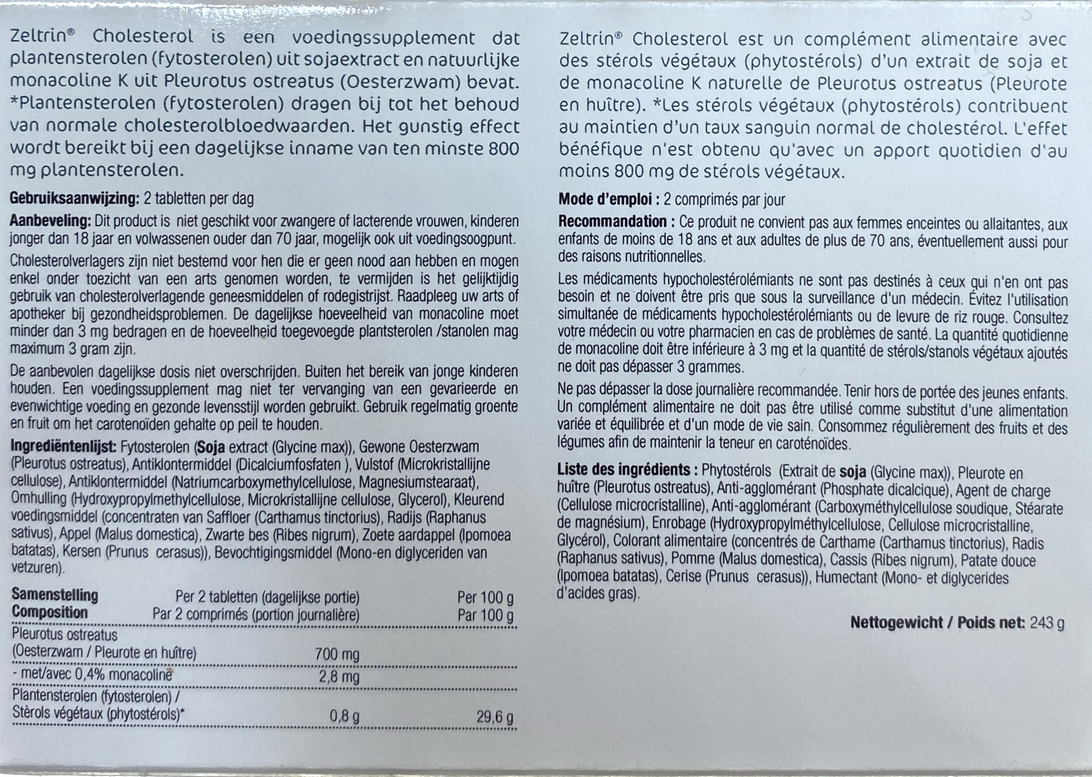 Zeltrin Cholesterol est un complément alimentaire avec des stérols végétaux* (phytostérols) d'un extrait de soja et de monacoline K naturelle de Pleurotus ostreatus (Pleurote en huître). *Les stérols végétaux (phytostérols) contribuent au maintain d'un taux sanguin normal de cholestérol. L'effet bénéfique n'est obtenu qu'avec un apport quotidien d'au moins 800 mg de stérols végétaux.