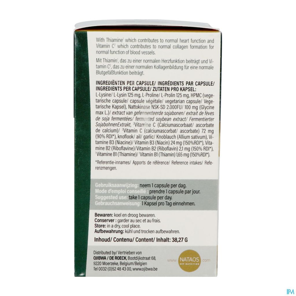 L-Lysine, L-Proline, HPMC, Nattokinase NSK-SD (Glycine max L.)/ extrait de graines de soja fermentées/, Vitamine C,