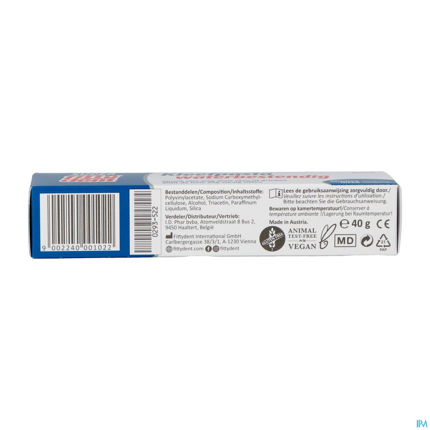 La pâte adhésive Fittydent est la seule colle pour prothèses dentaires au monde qui résiste à l'eau, ce qui l'empêche de glisser pendant que vous mangez et buvez. Elle assure une adhérence très forte, de sorte que la prothèse reste bien fixée à la gencive tout au long de la journée. La pâte adhésive Fittydent vous offre la liberté et la confiance nécessaires pour parler et rire librement toute la journée, et pour manger et boire sans souci ni gêne.