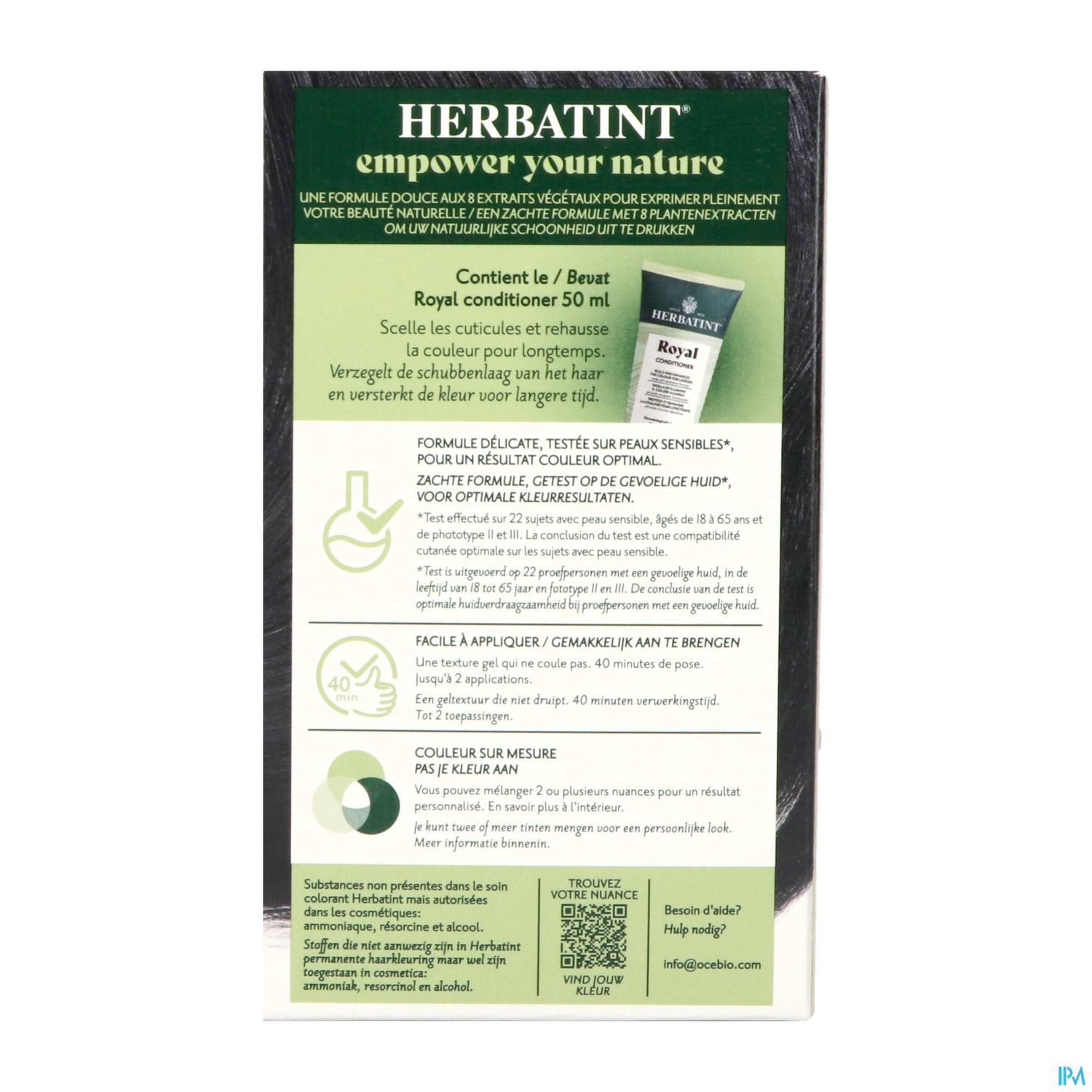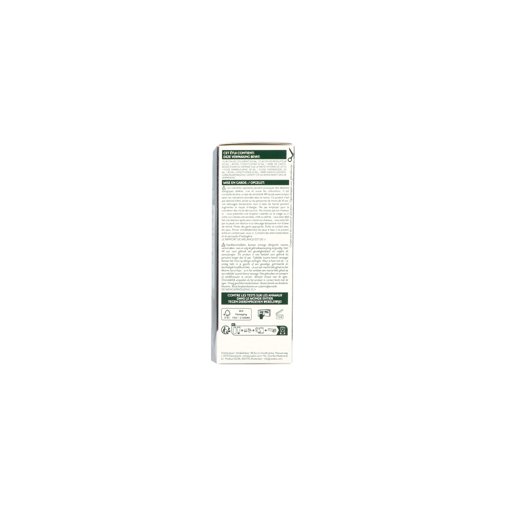 Le révélateur contient une faible concentration de peroxyde d'hydrogène (moins de 3 % après mélange), bien en deçà de la limite de 6 % autorisée par la législation européenne (CE NO 1223/2009). Herbatint utilise des ingrédients sans gluten et testés au nickel. Convient aux végétaliens.