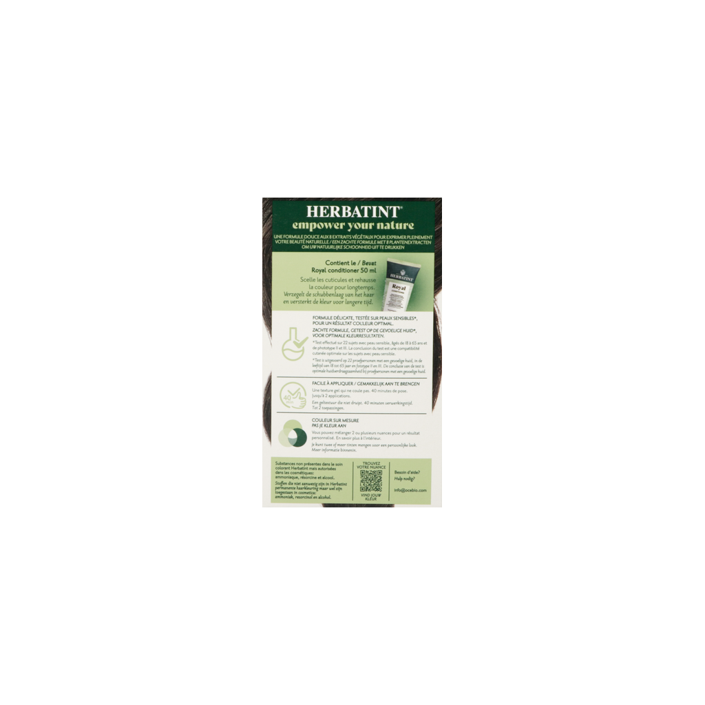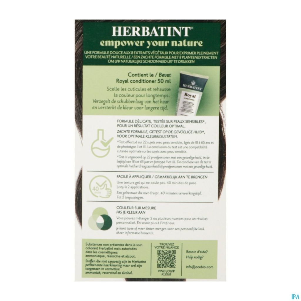 Le révélateur contient une faible concentration de peroxyde d'hydrogène (moins de 3 % après mélange), bien en deçà de la limite de 6 % autorisée par la législation européenne (CE NO 1223/2009). Herbatint utilise des ingrédients sans gluten et testés au nickel. Convient aux végétaliens.
