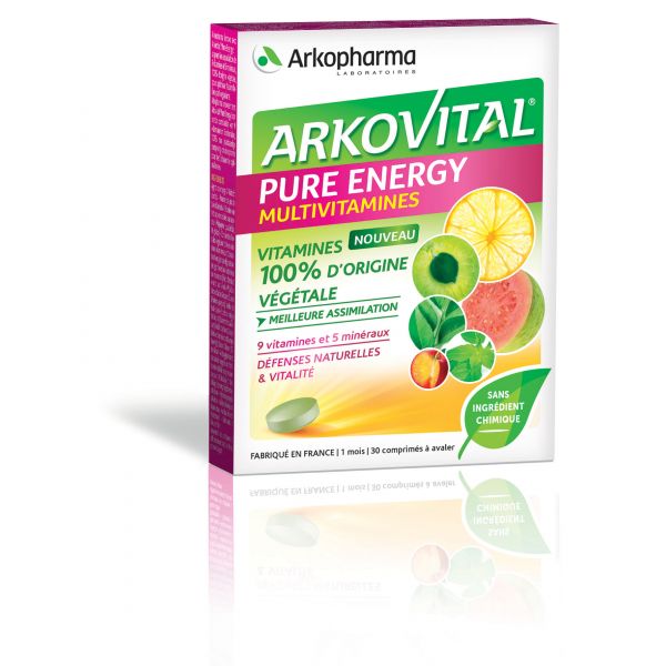 Arkovital Pure Energy est un complément alimentaire des laboratoires arkopharma. Il est composé à 100 % de vitamines et minéraux d'origine végétale. L'origine végétale de ces composants garantit une optimisation de l'assimilation de ces derniers par l'organisme.